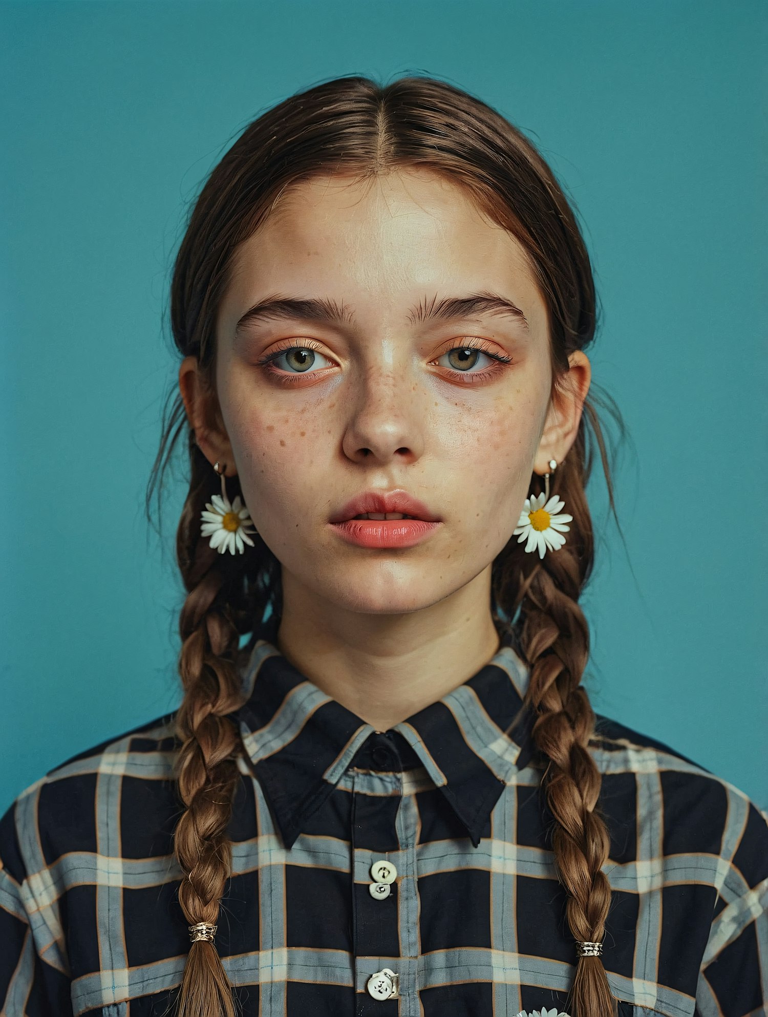 Young girl with braided hair and daisy earrings against a teal background, wearing a plaid shirt. Neutral expression, soft lighting.