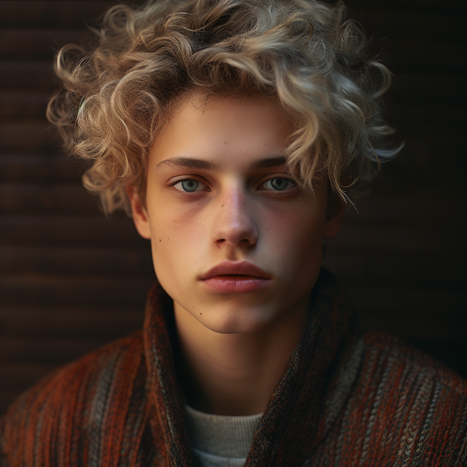 Portrait of a young man with curly blonde hair and blue eyes, wearing a textured sweater. Soft lighting and a blurred background enhance the focus.