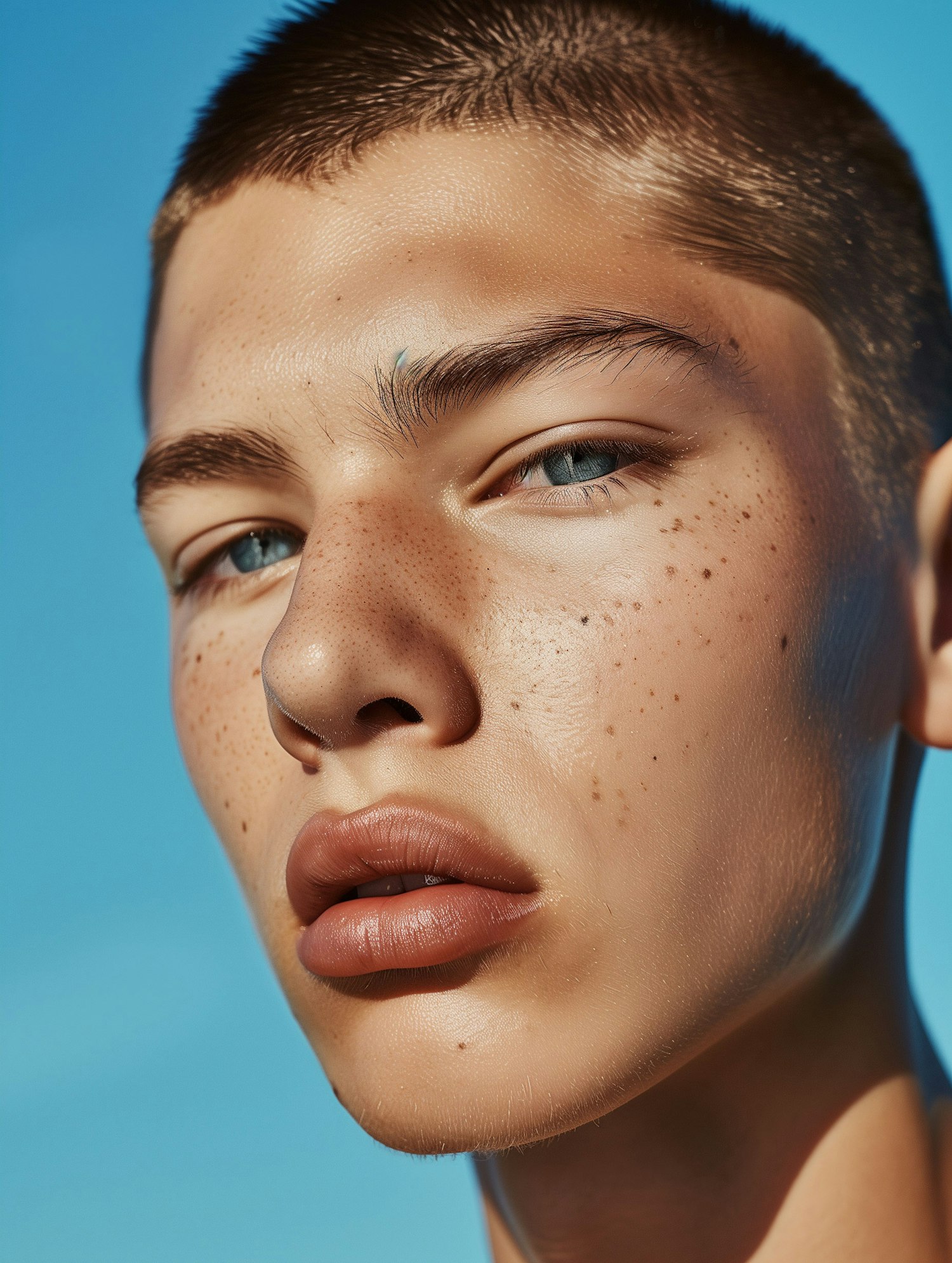 Close-up portrait of a young person with freckles, blue eyes, and short hair against a clear blue sky.