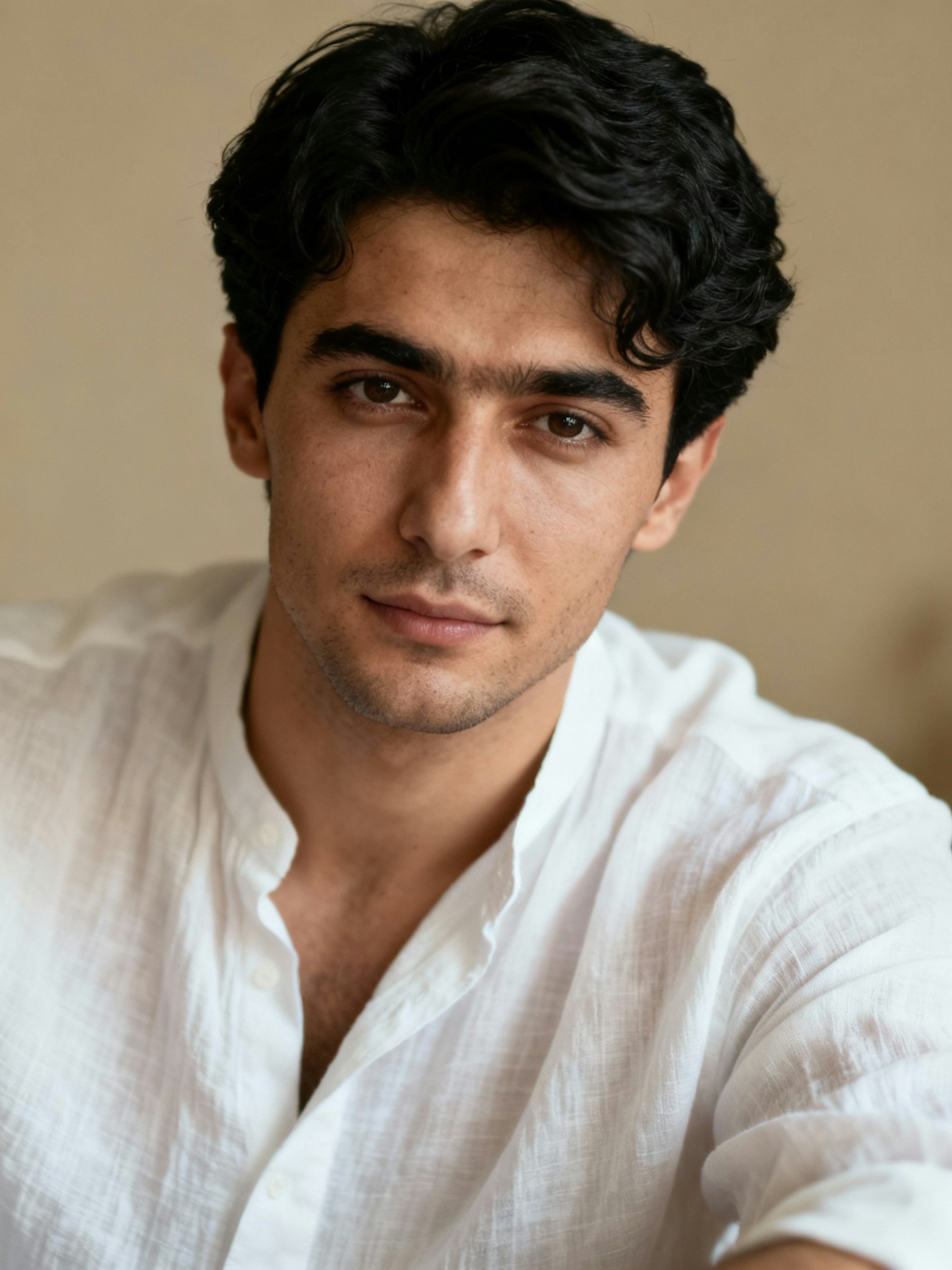 Portrait of a young man with wavy black hair and a white shirt, captured in soft natural light against a neutral background.