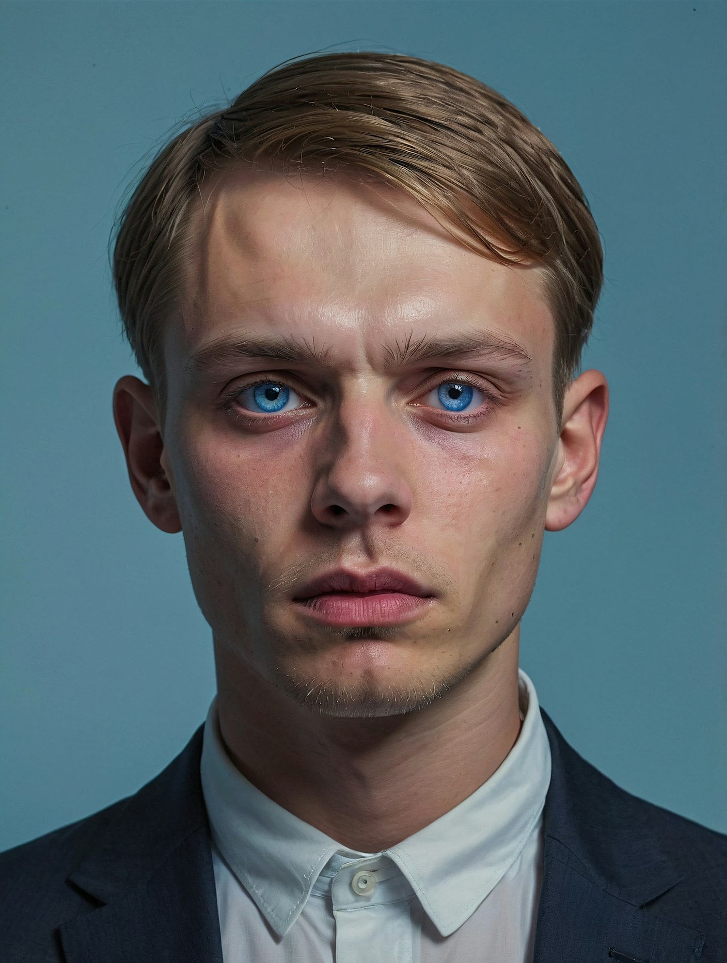 Young man with blue eyes and light brown hair in a suit, serious expression, against a muted blue background.