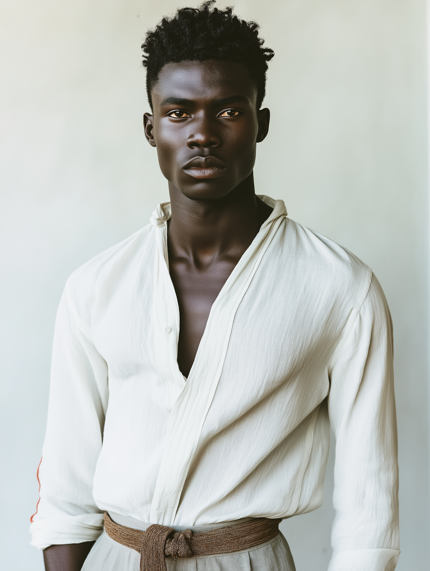 Portrait of a young Black man in a white shirt and gray trousers, exuding confidence and elegance against a neutral background.