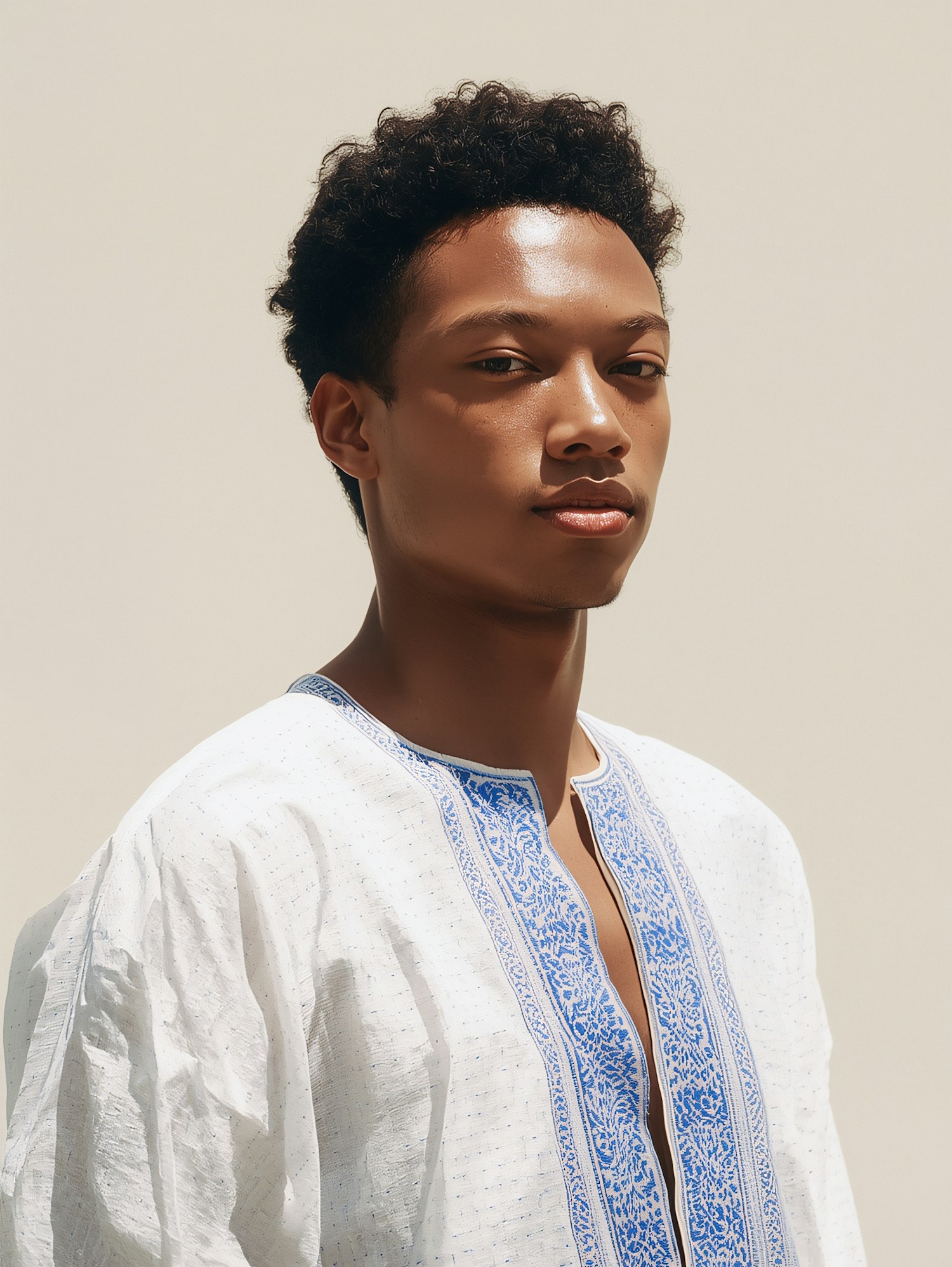 A young man in a white embroidered shirt with blue details stands against a beige background, exuding a calm and composed demeanor.