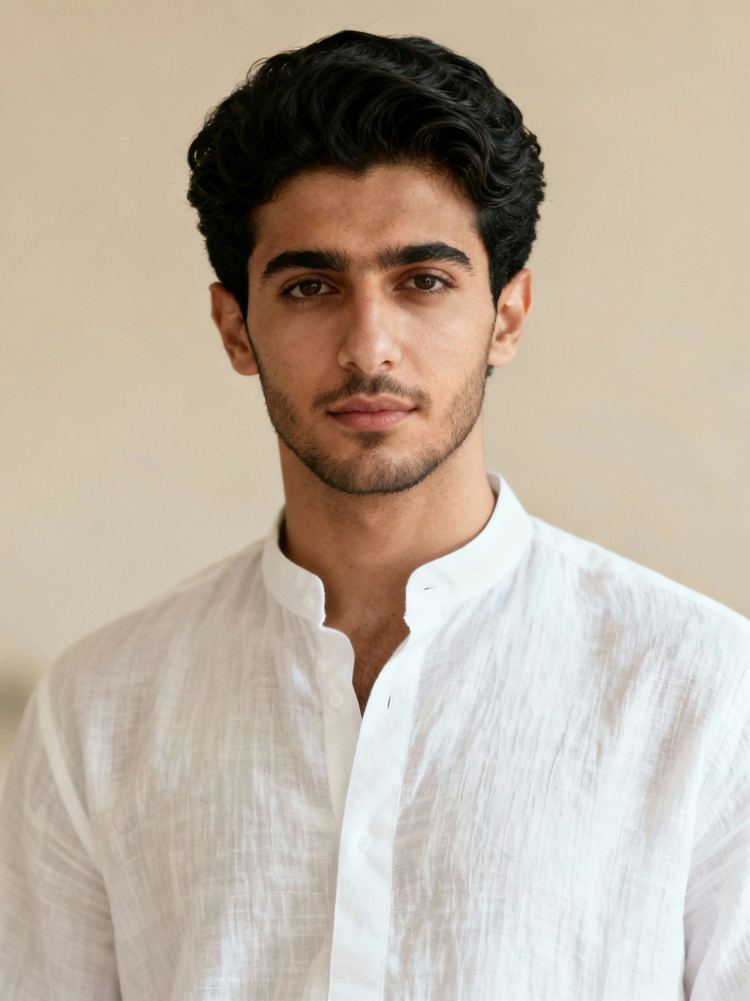 Cinematic portrait of a qatari man, 26; short wavy hair; white linen shirt. Background: plain beige, defocused.