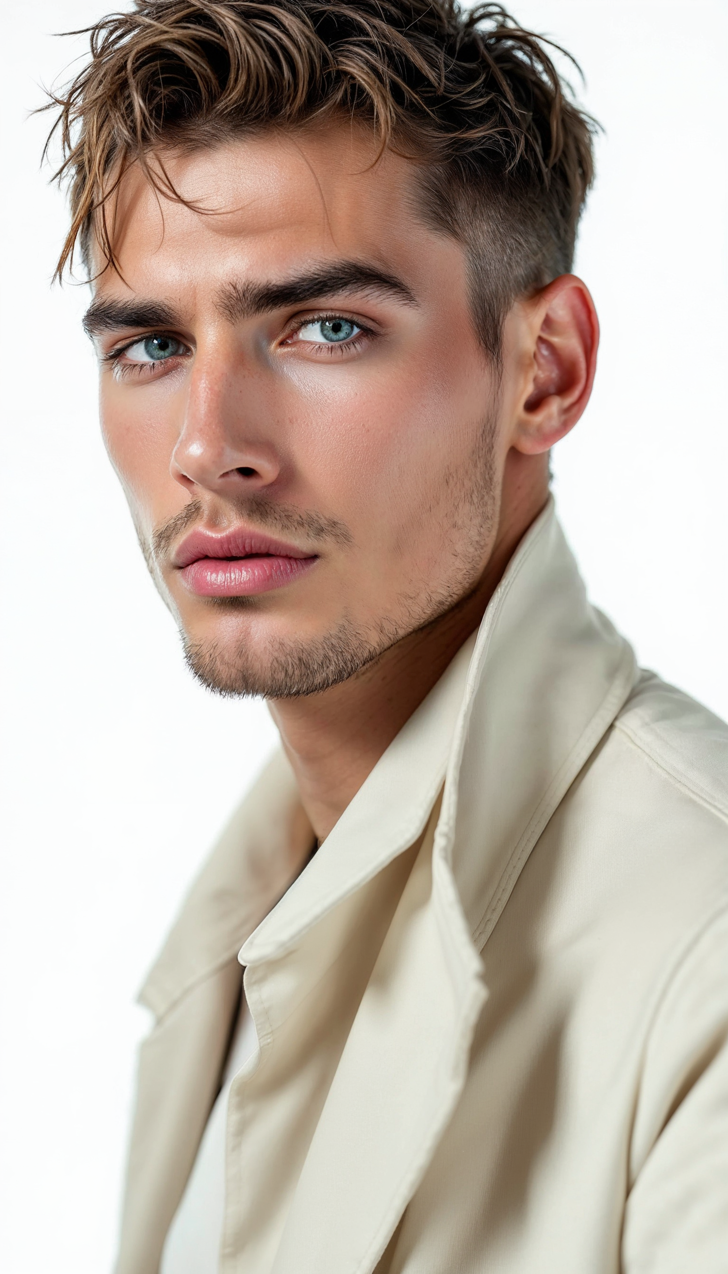 Young man with blue eyes and light brown hair in a beige trench coat, exuding confidence and style against a white background.
