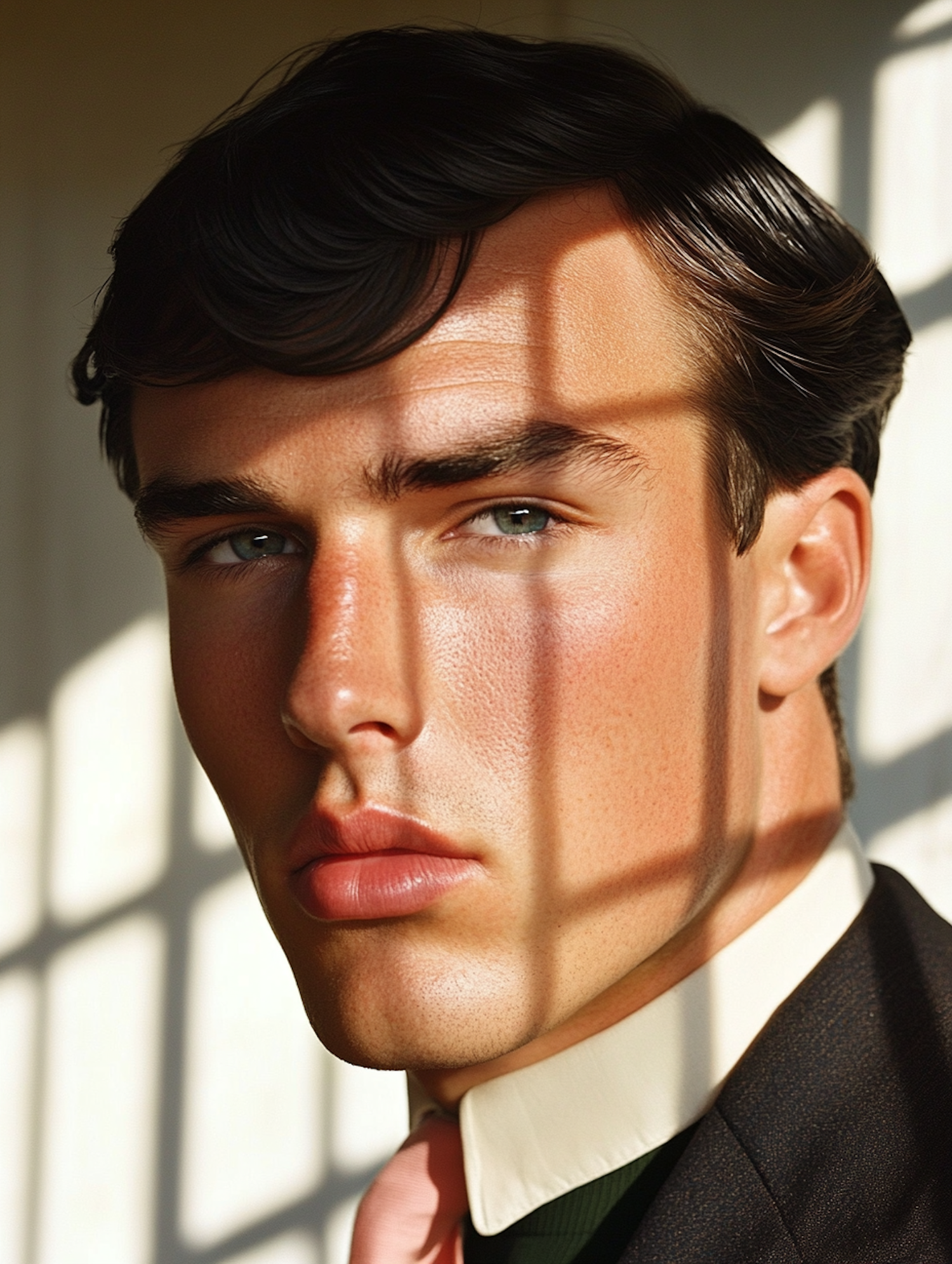 Close-up portrait of a young man with blue eyes and dark hair, wearing a suit. Shadows create an intriguing pattern on his face.
