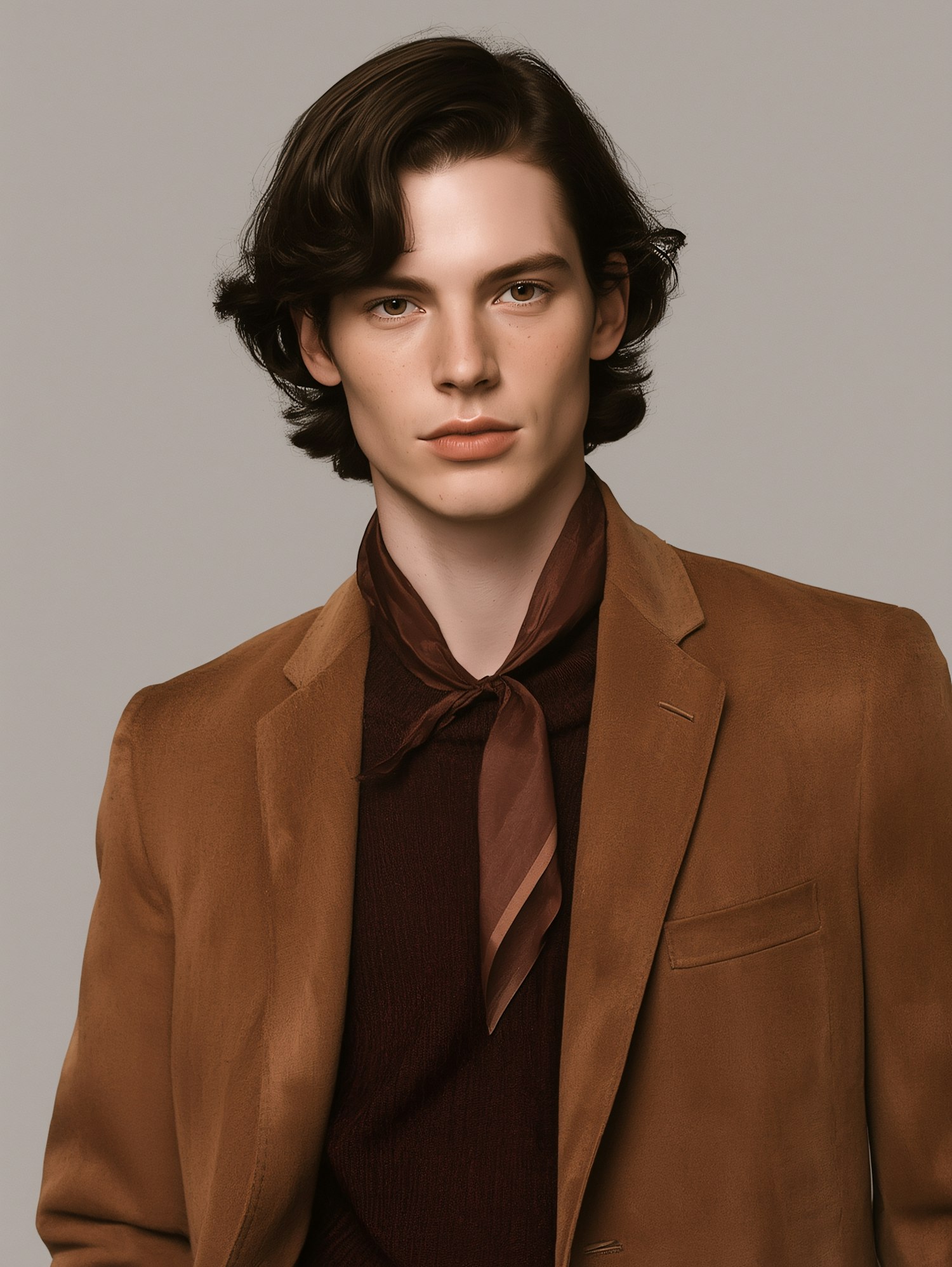 Stylish young man in a brown blazer and scarf, with wavy dark hair and a neutral gray background, showcasing a modern, elegant look.