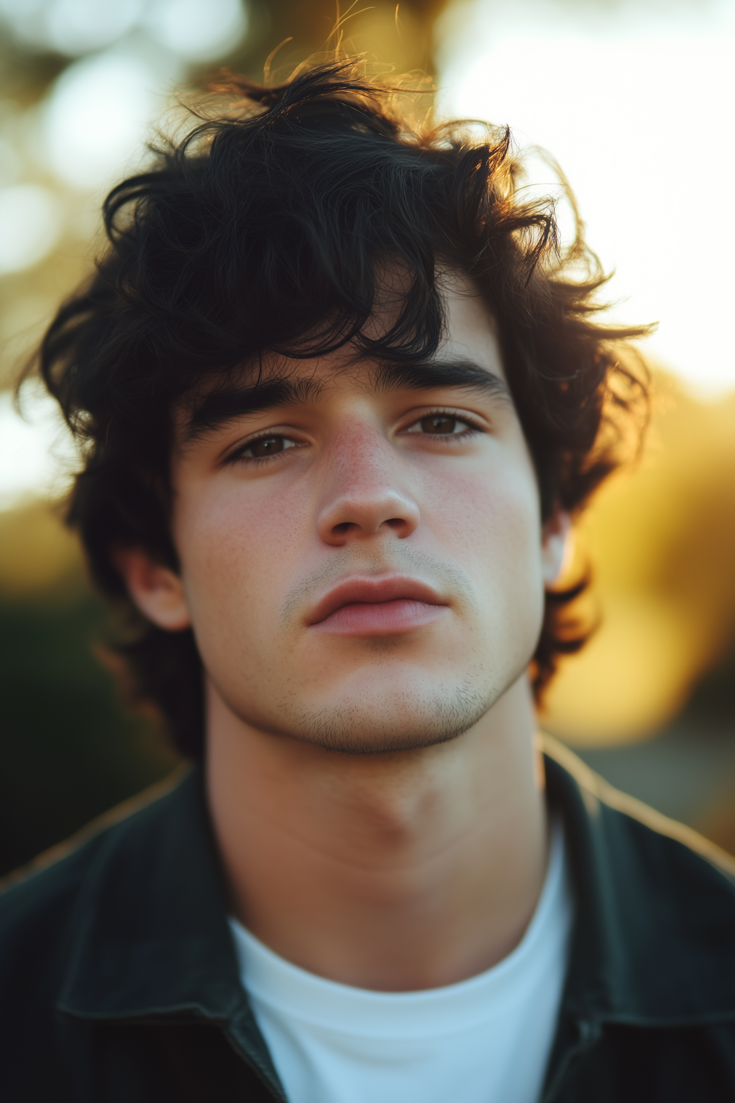 Young man with dark wavy hair and calm expression, set against a warm, blurred background. Natural lighting highlights his features.