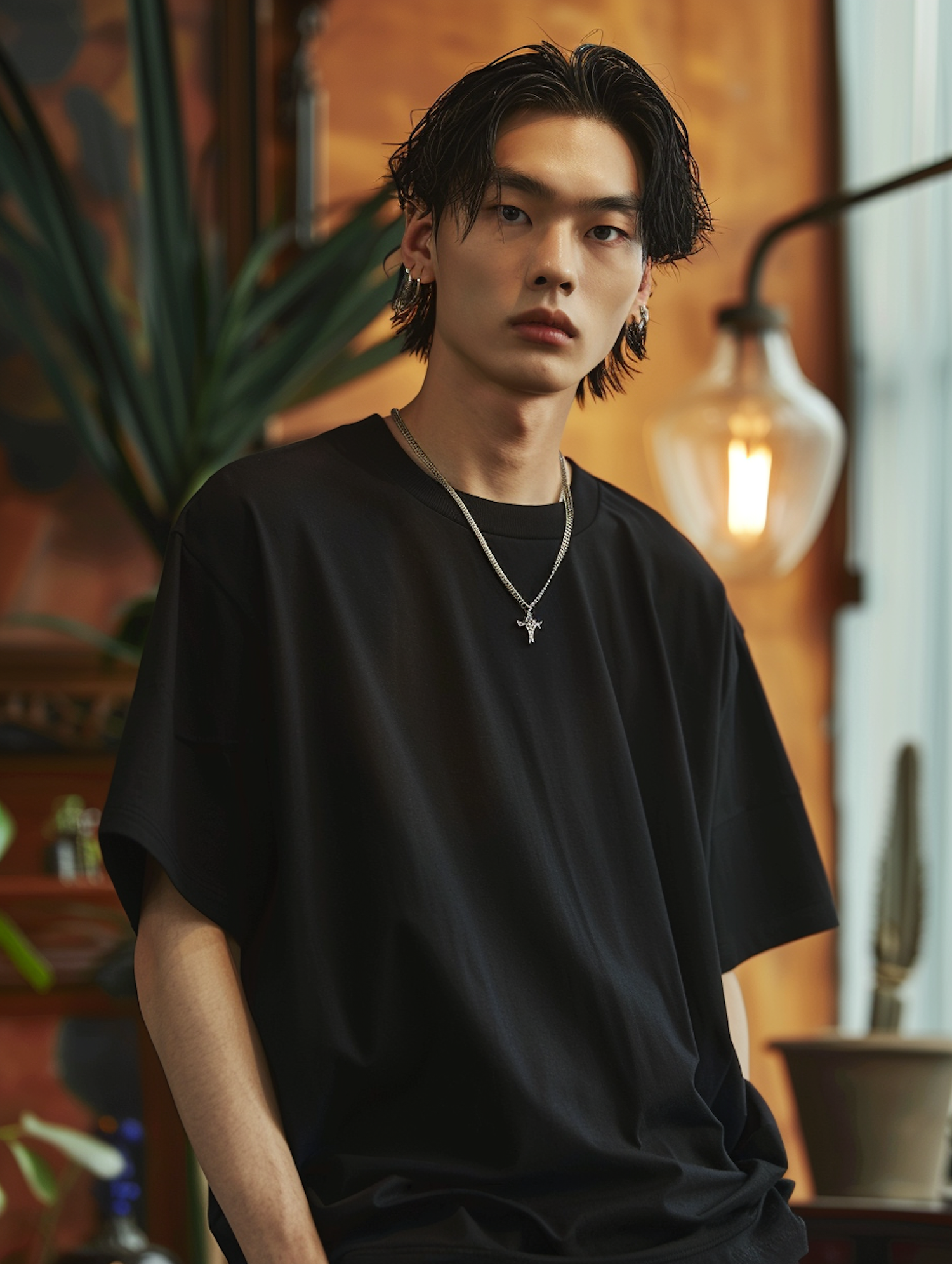 Asian male with black hair and a black t-shirt, wearing a silver cross necklace. Warm-toned background with a plant and vintage light bulb.