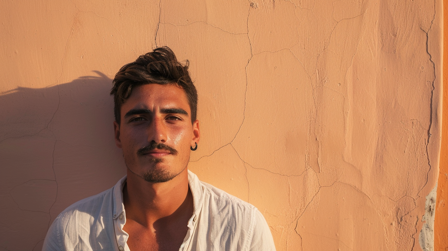 Young man with tanned skin and dark hair against a peach wall, wearing a white shirt. Sunlight highlights his relaxed, confident expression.