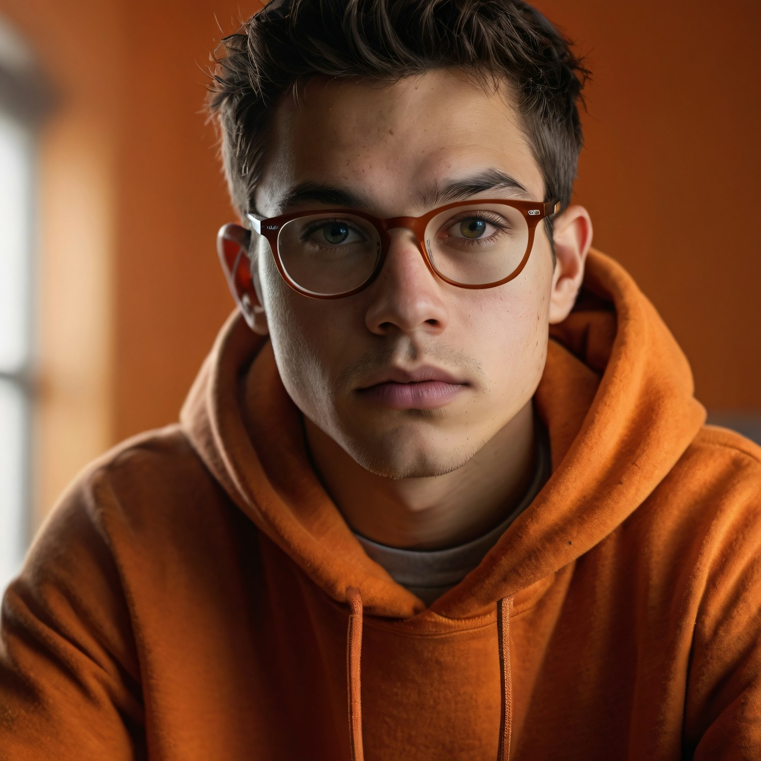 Young man in orange hoodie and glasses, gazing intently with a neutral expression against a warm, blurred background.