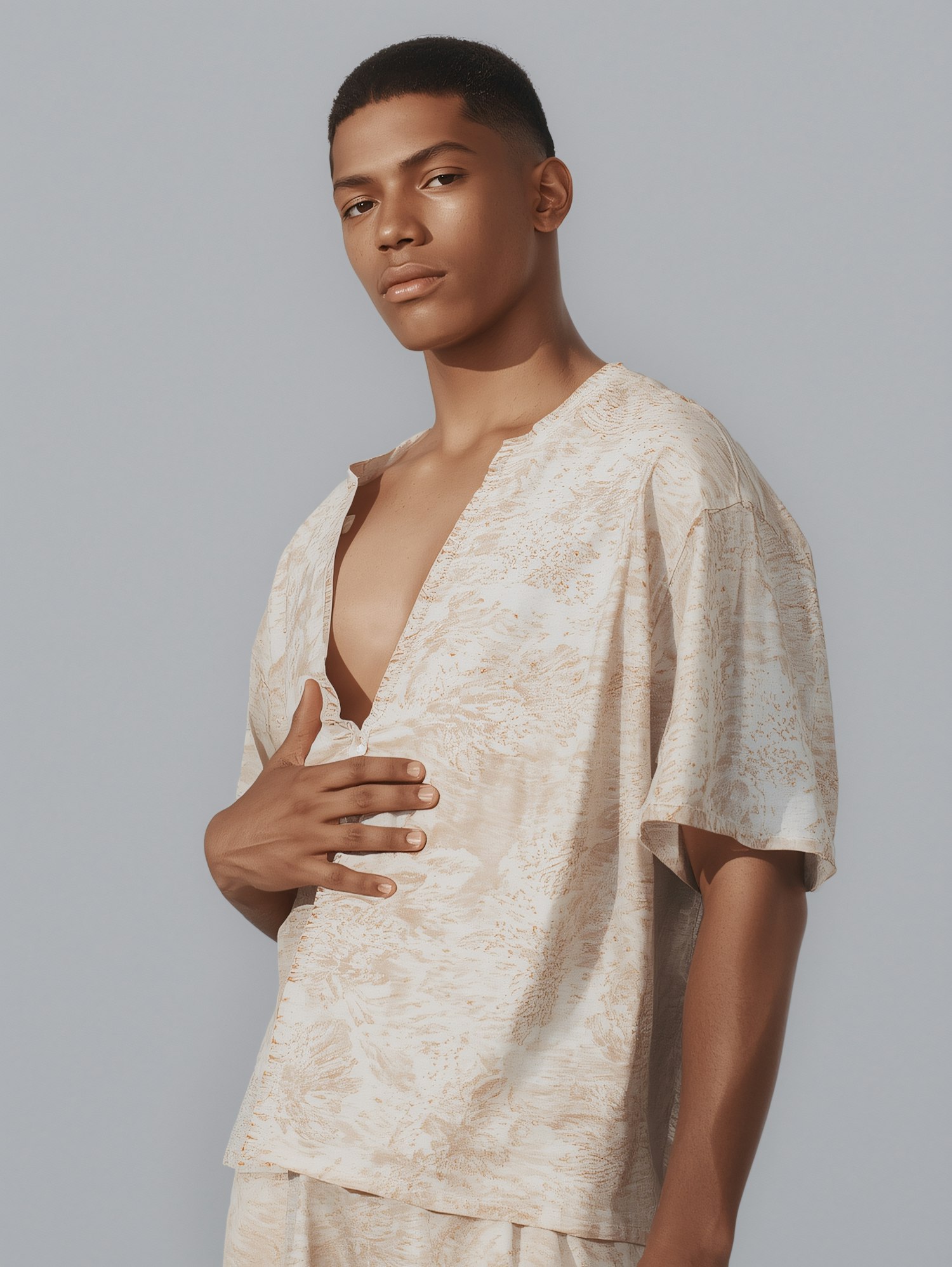 Stylish young man in a beige floral shirt posing confidently against a light gray background, showcasing modern casual fashion.