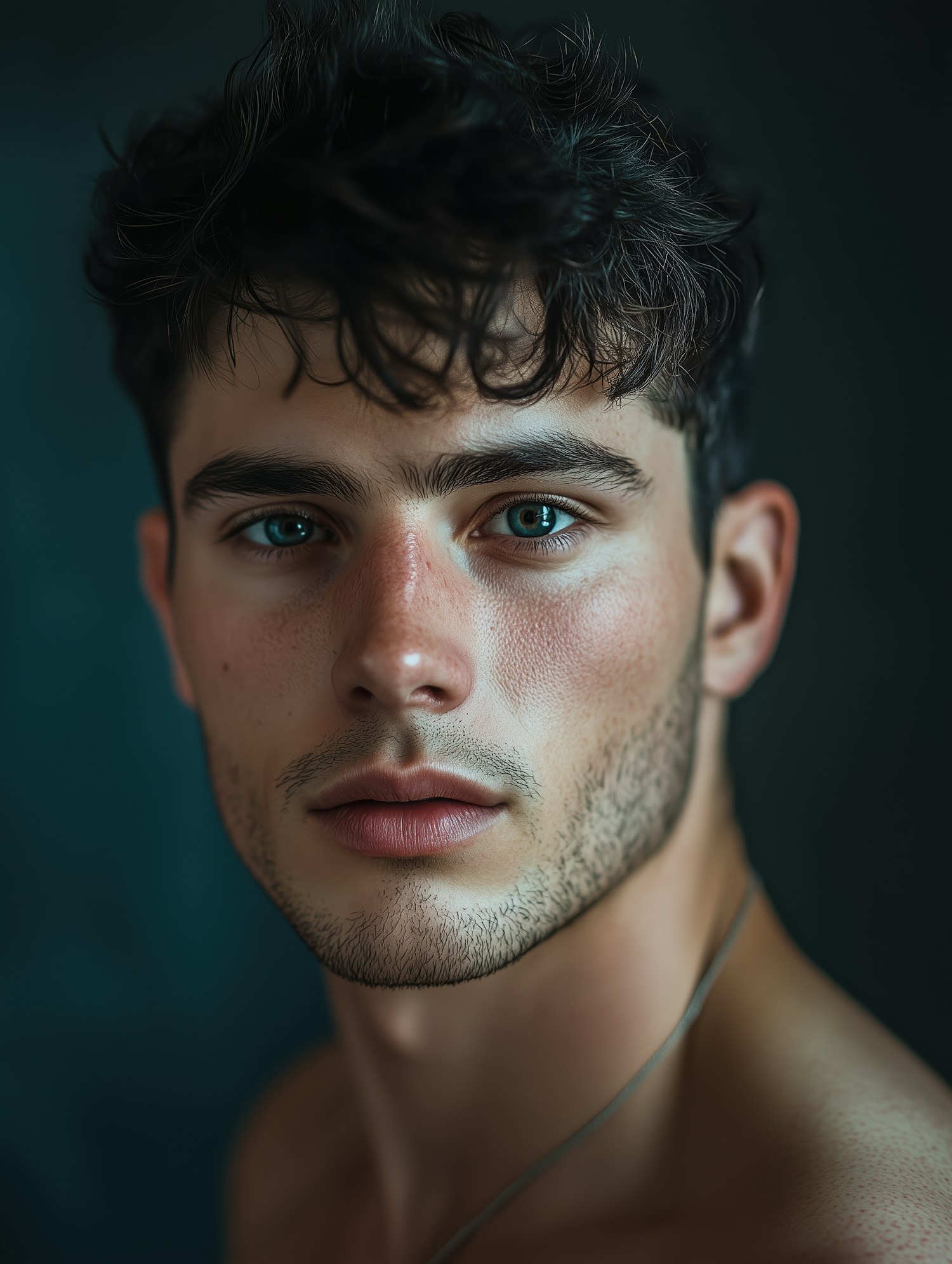Portrait of a young man with blue eyes, dark hair, and light stubble, set against a blurred teal background.