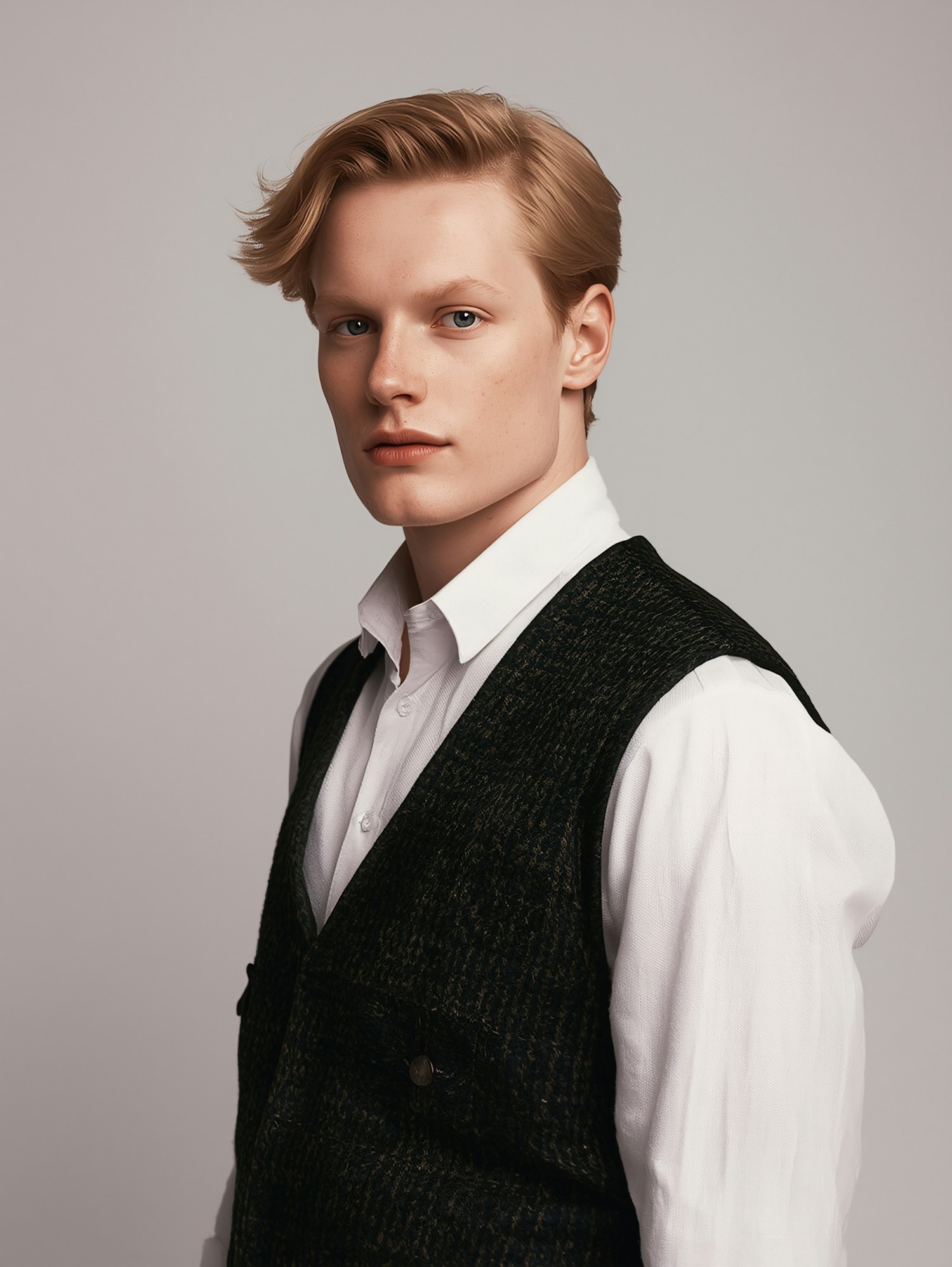 A young man with blonde hair and a classic outfit poses confidently against a neutral background, showcasing a timeless style.