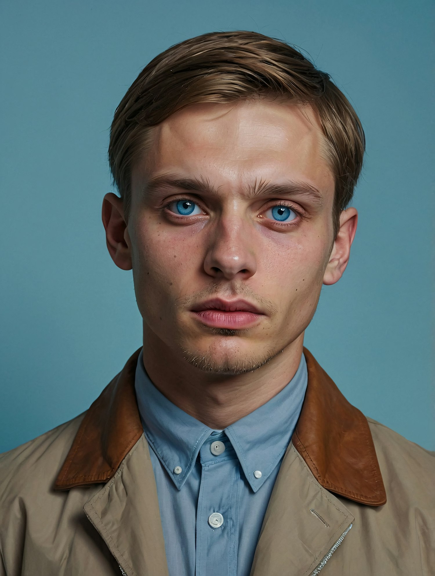 Young man with blue eyes and light brown hair in a beige jacket against a blue background.