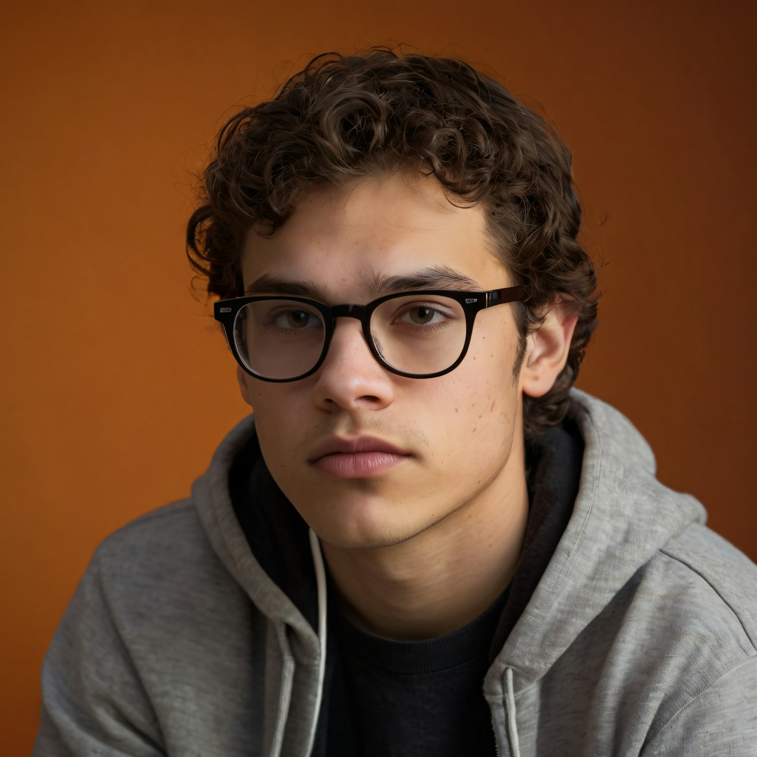 Young man with curly hair and glasses in a gray hoodie against an orange background, looking serious.
