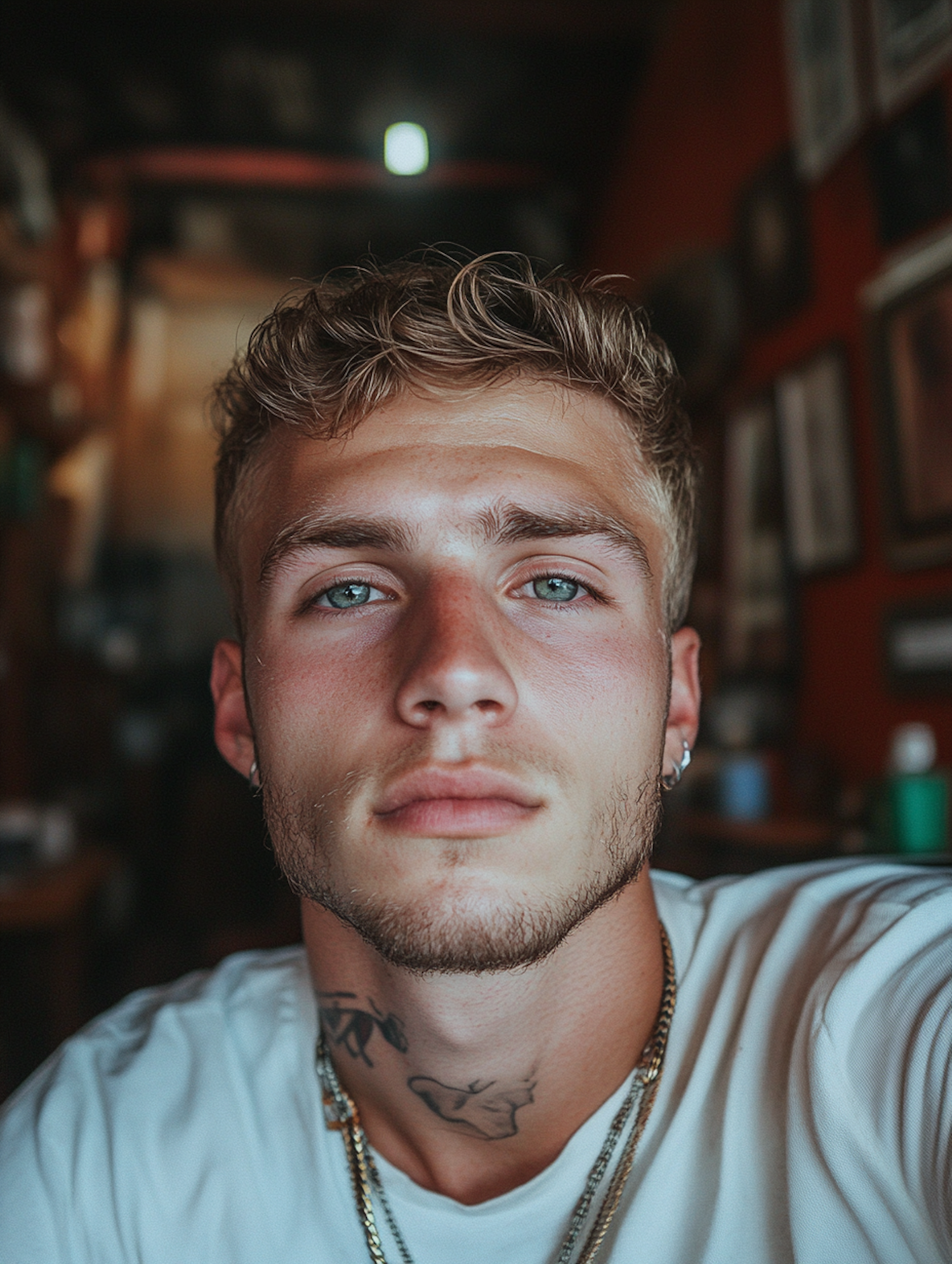 Young man with curly blonde hair, blue eyes, and a neck tattoo, wearing a white t-shirt and earrings, in a warmly lit indoor setting.