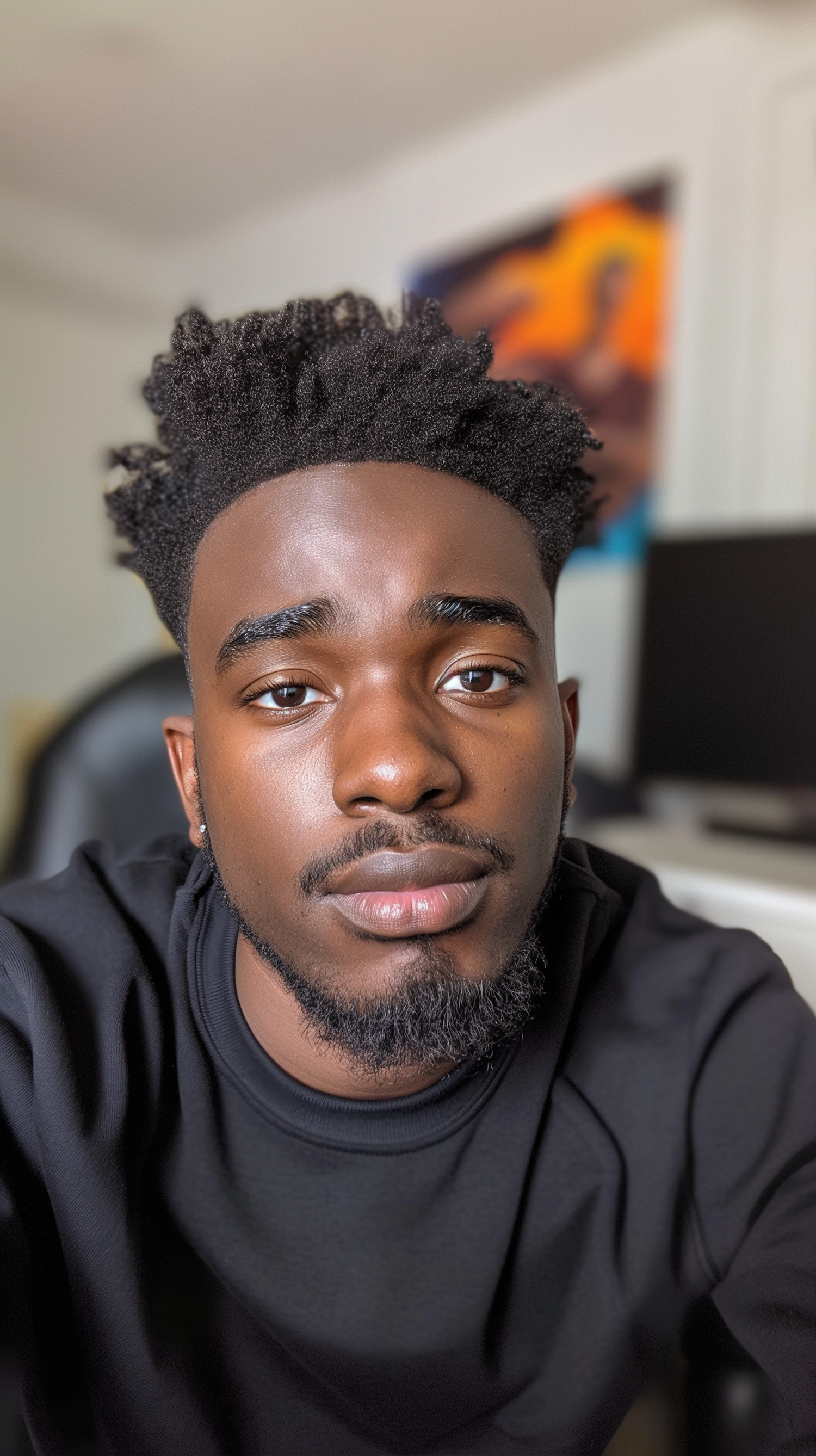 Close-up portrait of a young Black man with textured afro hair, a beard, and a calm expression, wearing a black sweatshirt indoors.