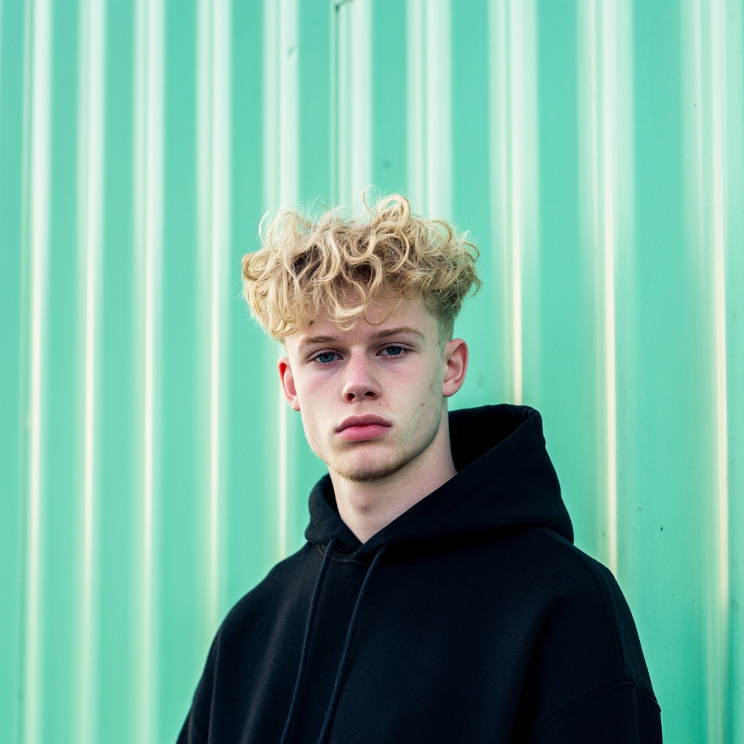 Young man with curly blonde hair in a black hoodie against a mint green wall, creating a striking contrast.