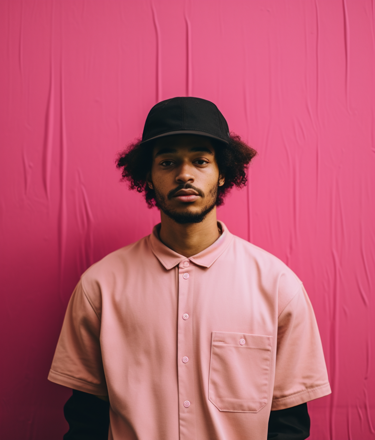 Young man in a pink shirt and black cap against a vibrant pink background, exuding casual style and introspection.