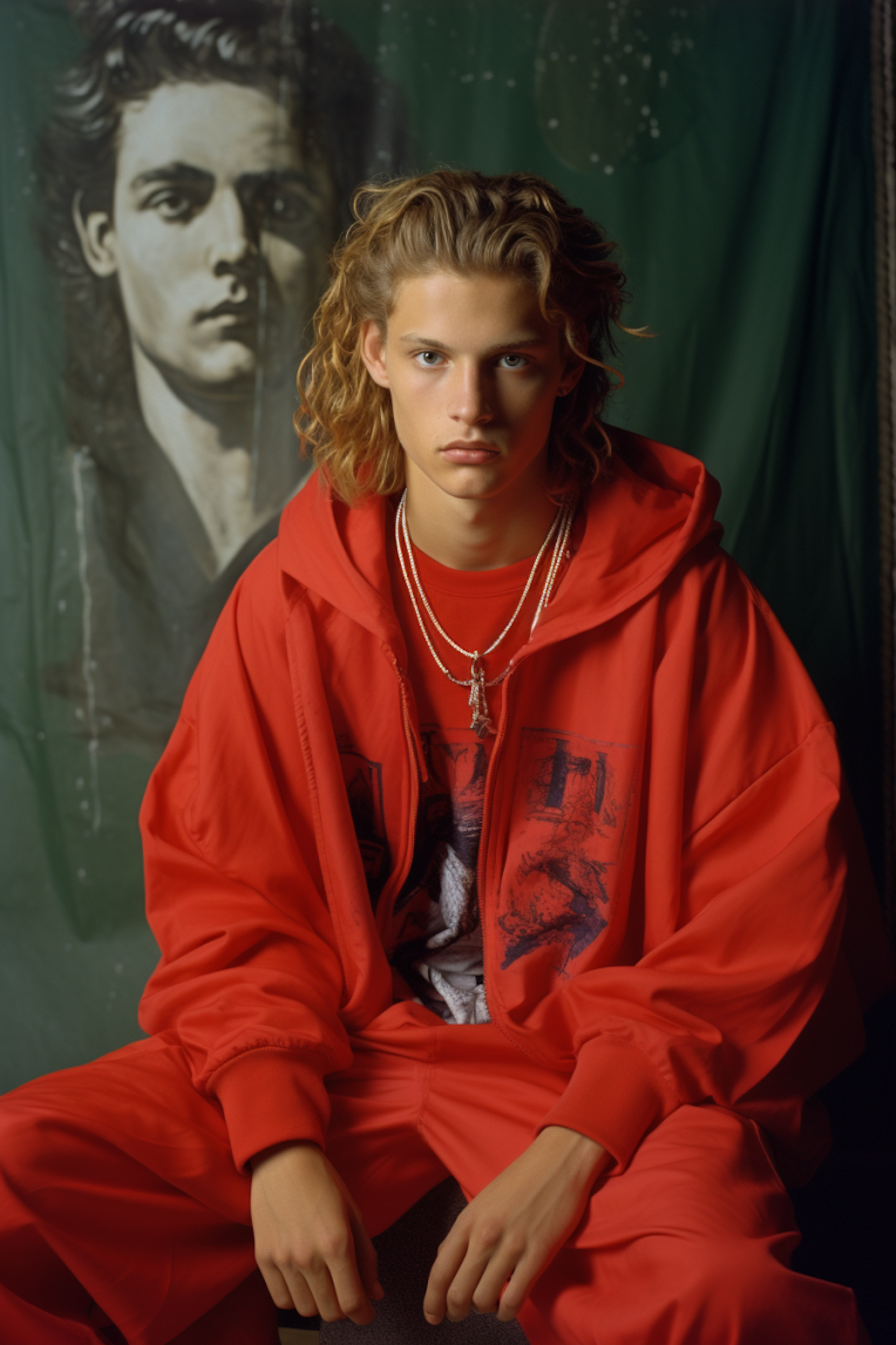 Young man in red outfit with long blonde hair and blue eyes, sitting confidently with a portrait in the background.