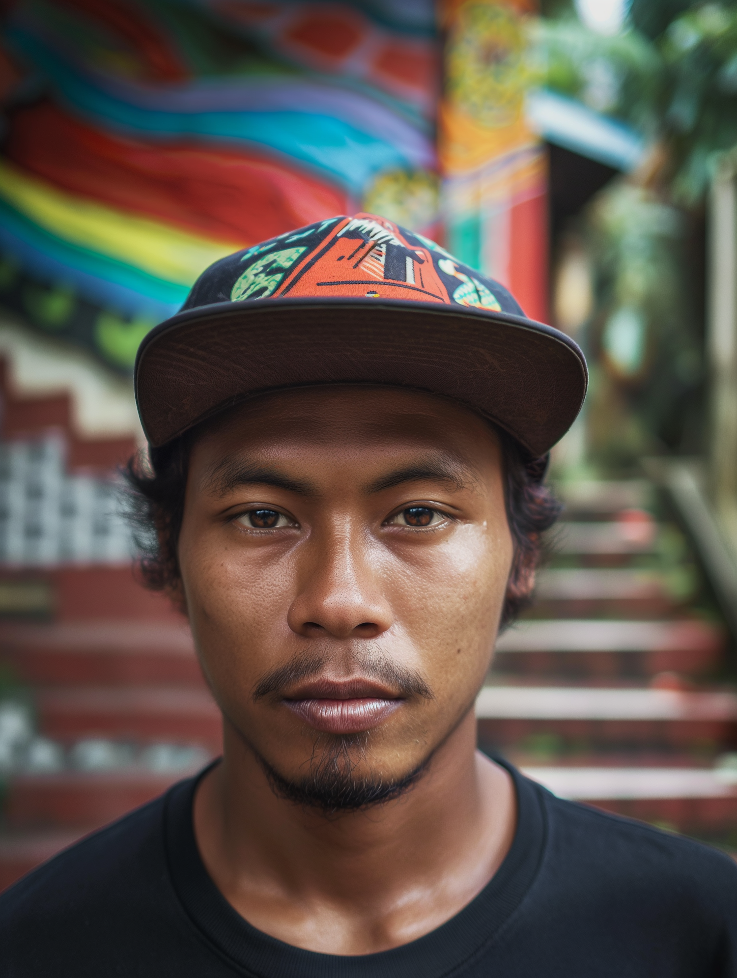 Portrait of a young Asian man with a colorful cap, standing in front of a vibrant mural. Neutral expression, black t-shirt.