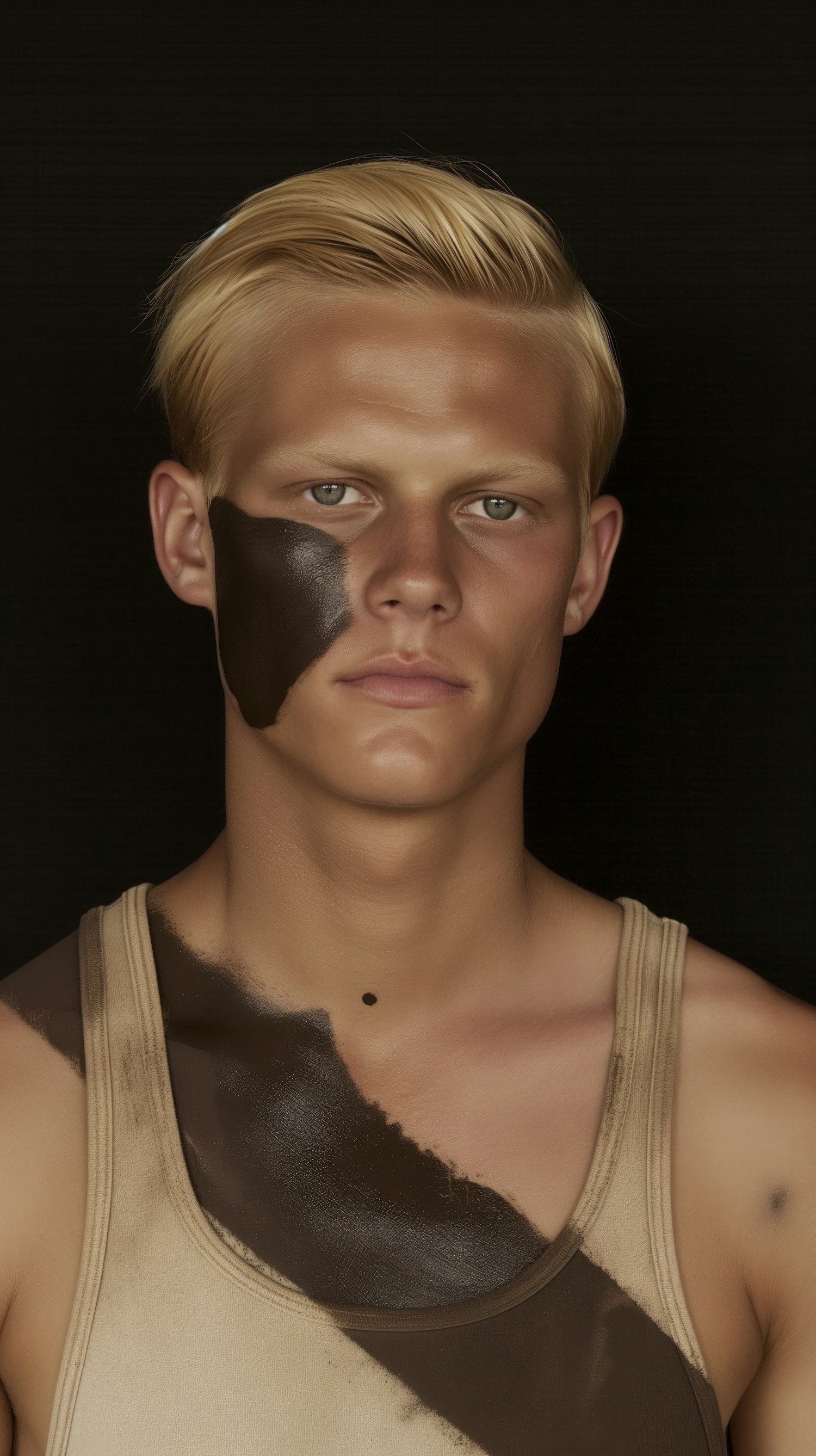 Young man with blonde hair and paint on face, wearing a beige tank top against a dark background.