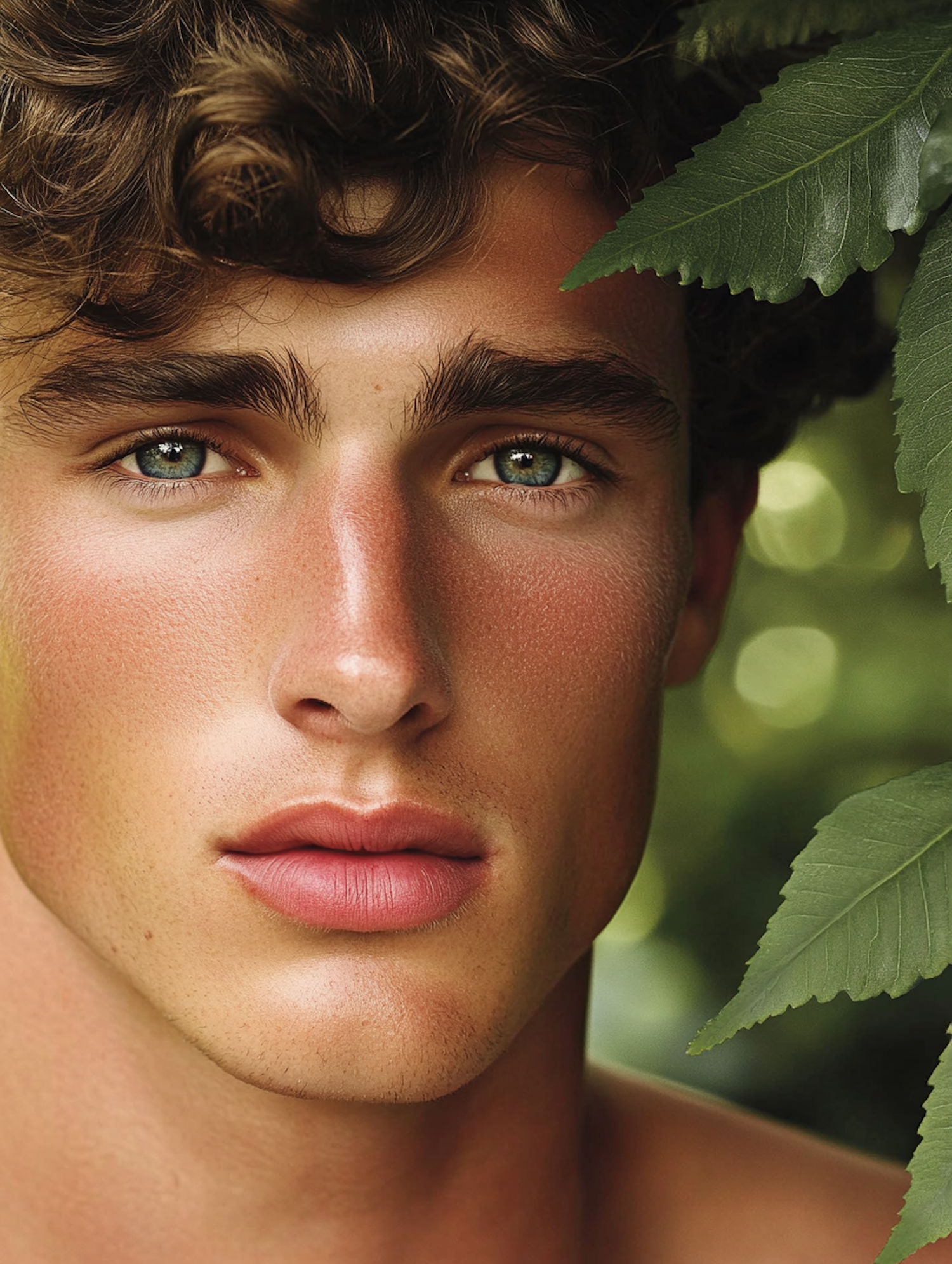 Close-up portrait of a young man with curly hair and green eyes, surrounded by lush green foliage.