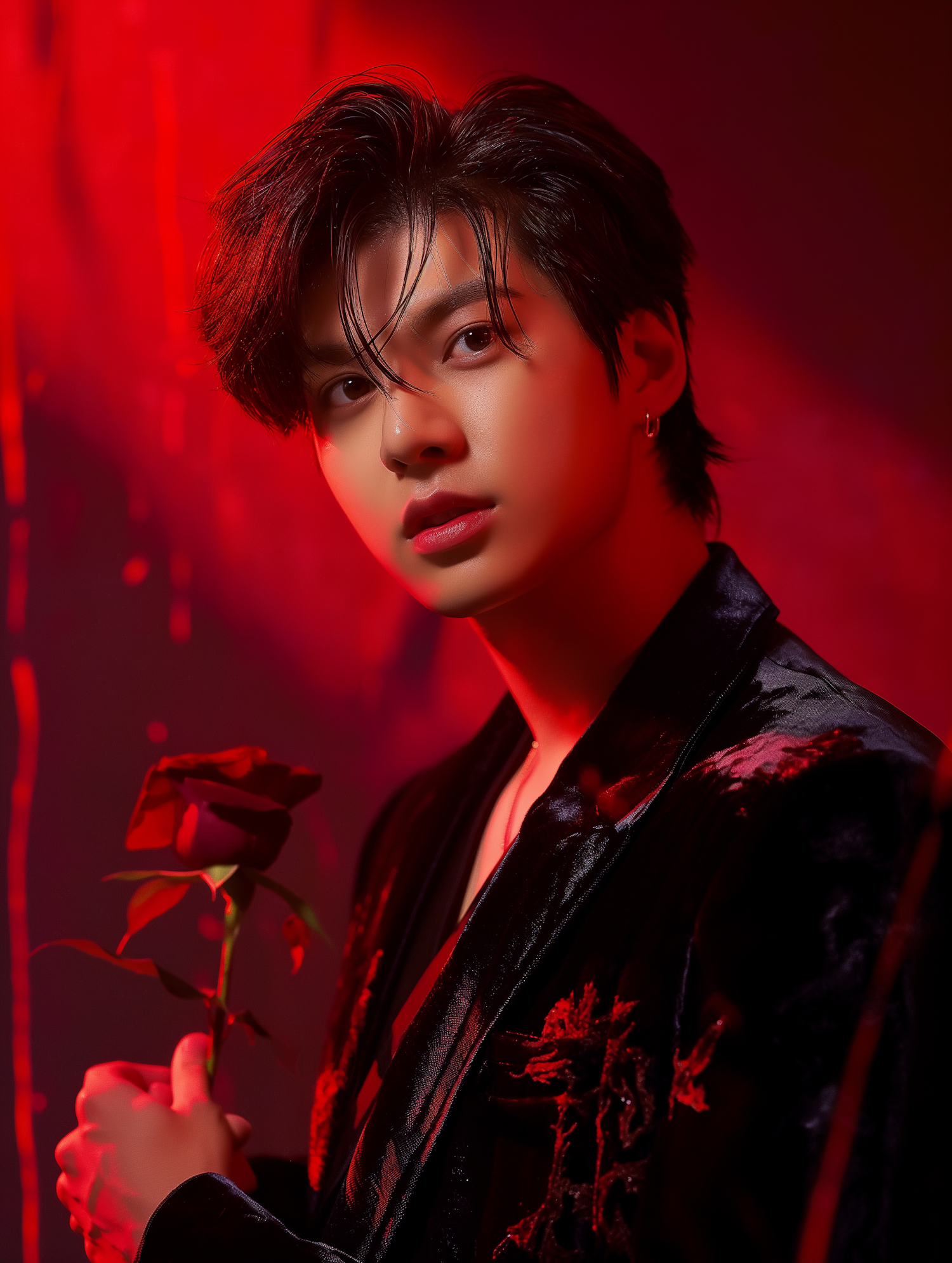 Asian male with dark hair holds a red rose, wearing a black velvet jacket with red embroidery, set against a dramatic red background.