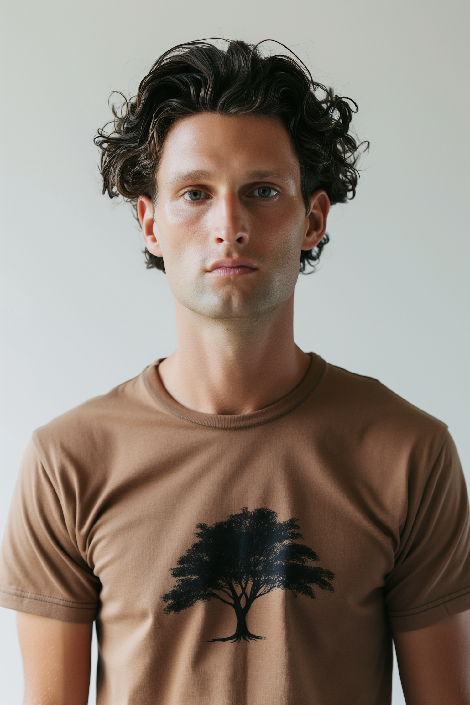 Young man with curly hair in a brown t-shirt featuring a tree silhouette, standing against a plain background.