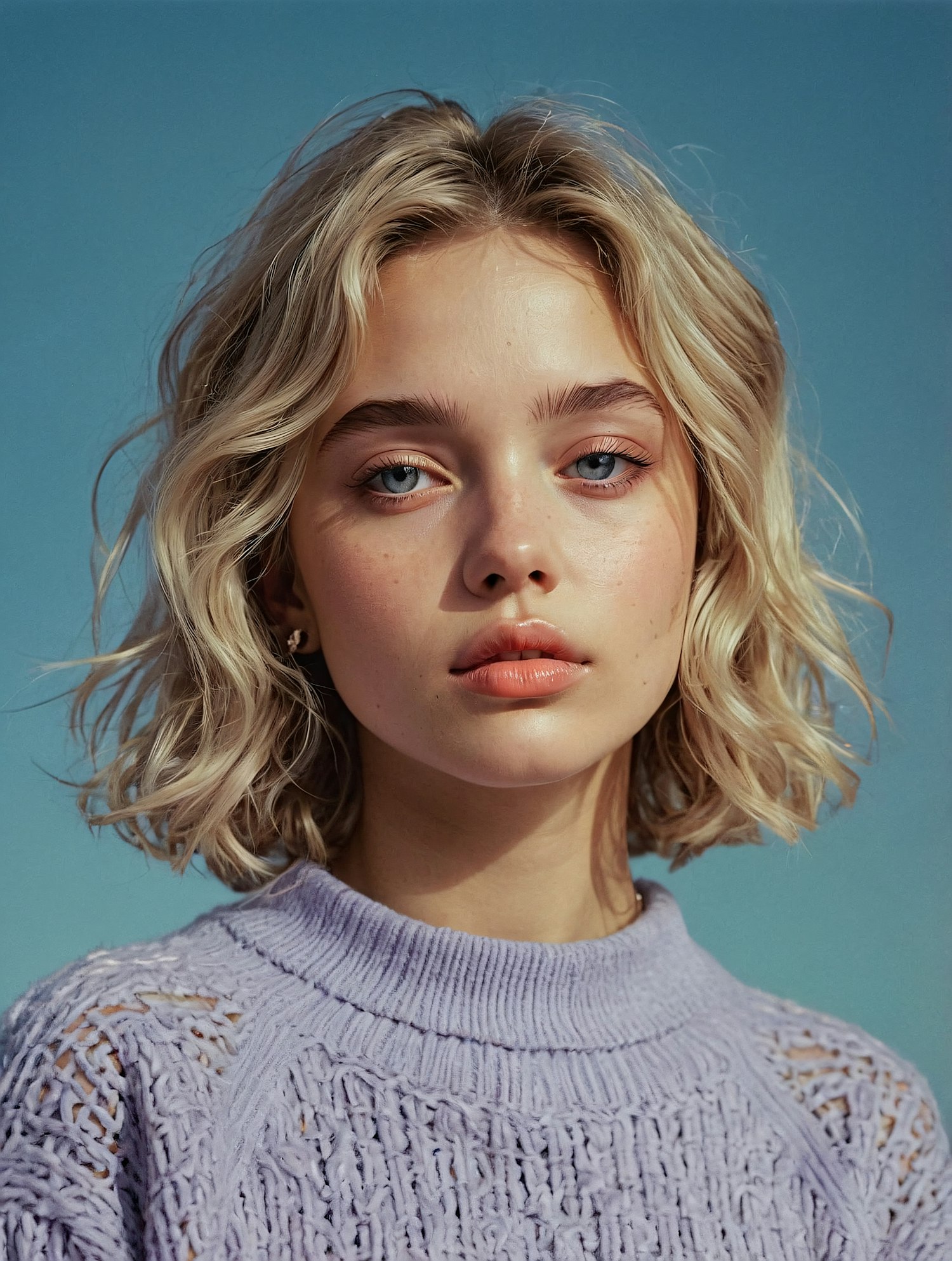 Young woman with blonde hair and blue eyes in a purple sweater against a clear blue sky, exuding calm and serenity.