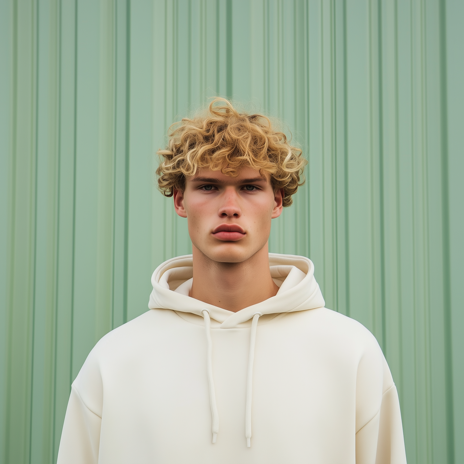 Young man with curly blonde hair in a cream hoodie against a green panel background, showcasing a modern and minimalist style.
