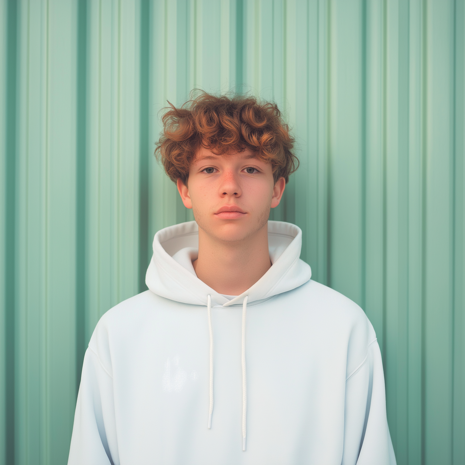 Young man with curly hair in a white hoodie against a mint-green background, exuding a calm and serene vibe.