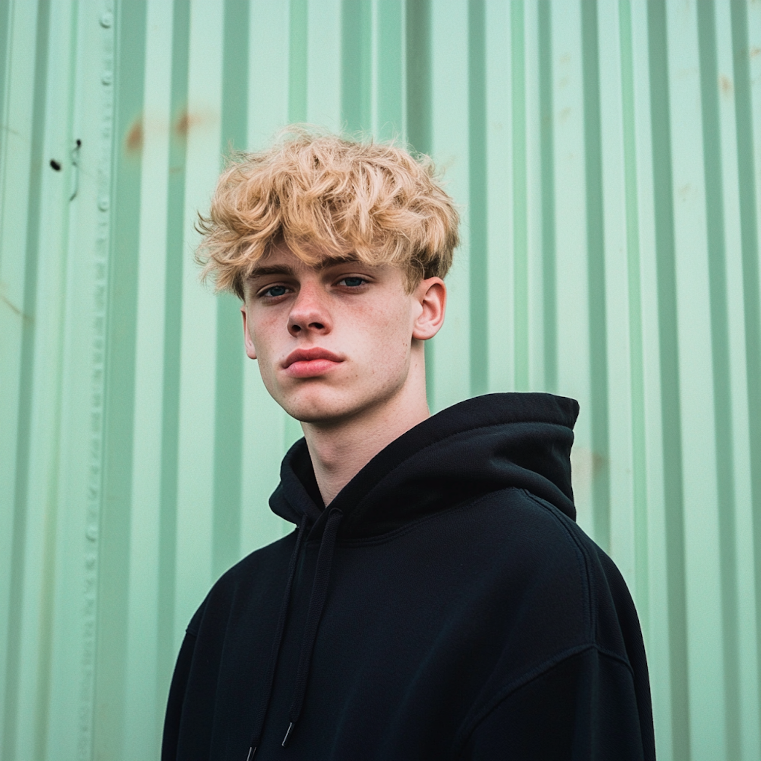 Young man with blonde hair in a black hoodie against a green corrugated wall, exuding a modern, urban vibe.
