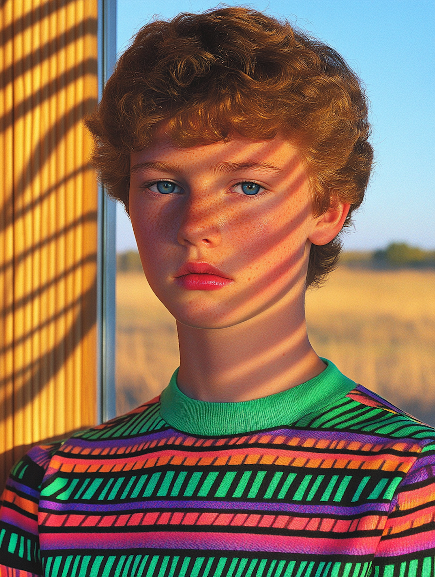 Young boy with curly hair and freckles in colorful striped shirt, sunlight casting shadows on face, against a natural backdrop.