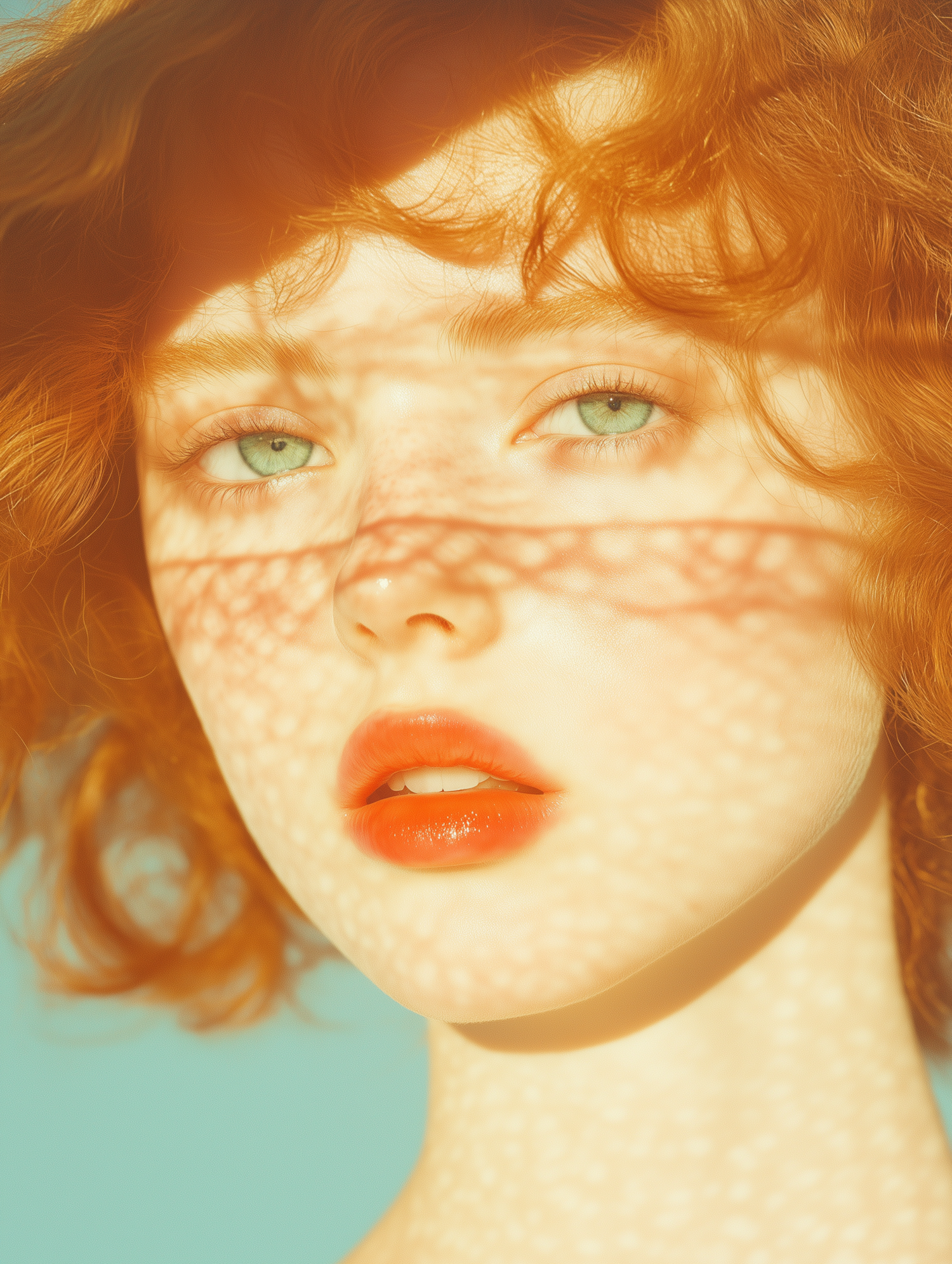 Close-up of a young woman with red hair and green eyes, sunlight casting shadows on her face, against a soft blue background.