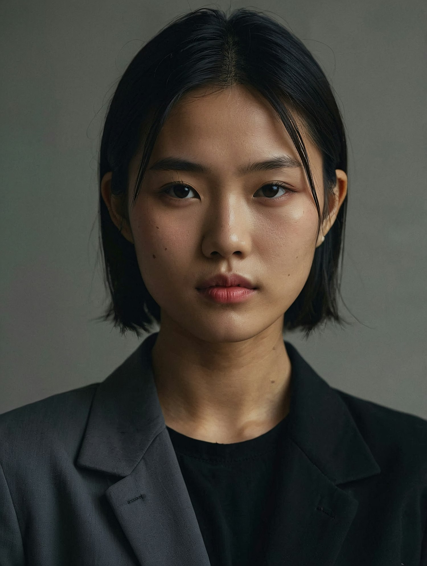 Portrait of an Asian woman with a bob haircut, wearing a dark blazer. She has a calm expression against a muted gray background.