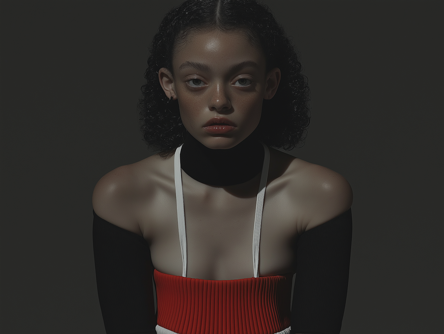 A young woman with curly hair in a dramatic red and black outfit, set against a dark background, exudes intensity and elegance.
