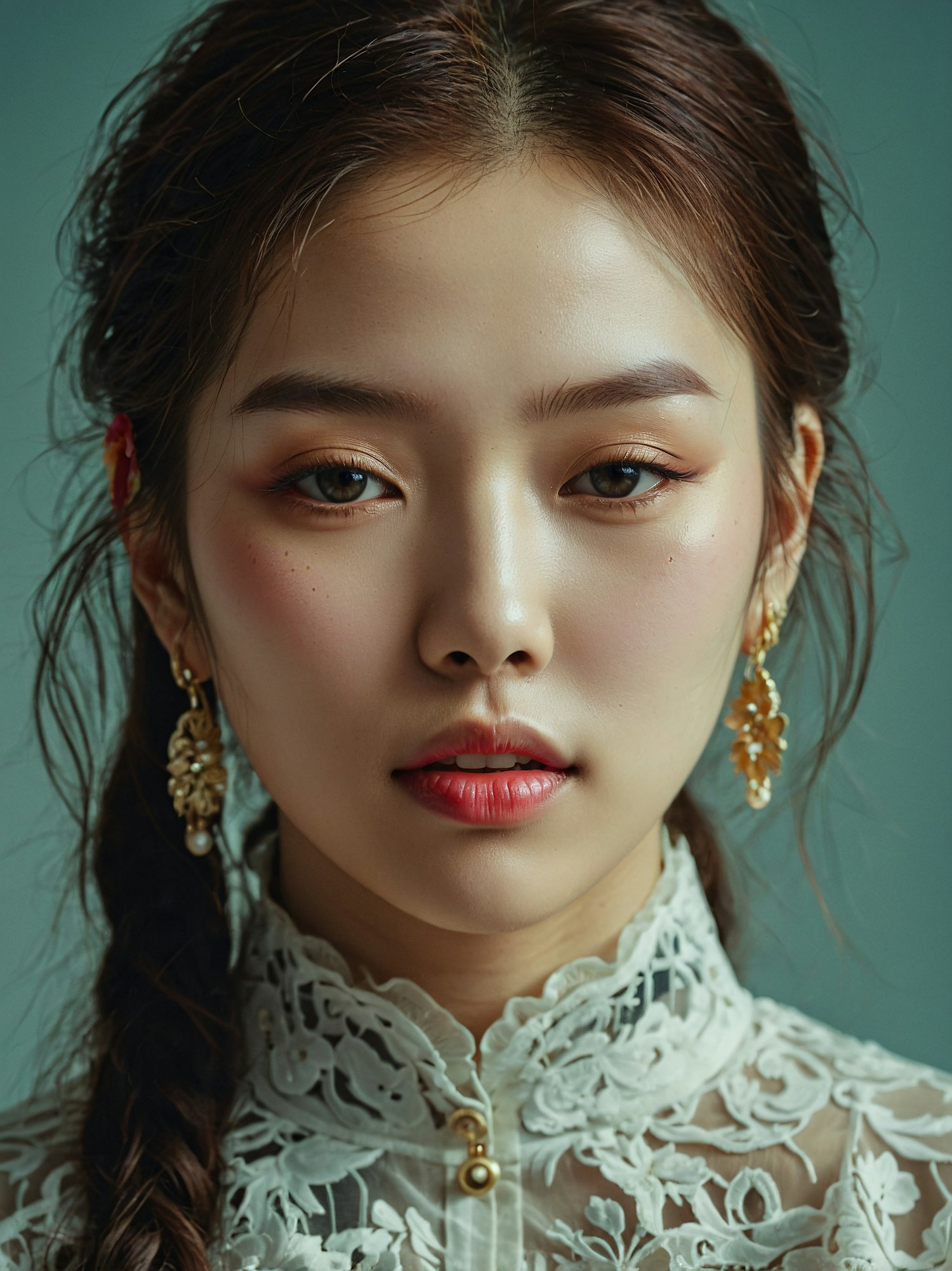Elegant portrait of an Asian woman with braided hair, gold earrings, and a lace blouse against a teal background.