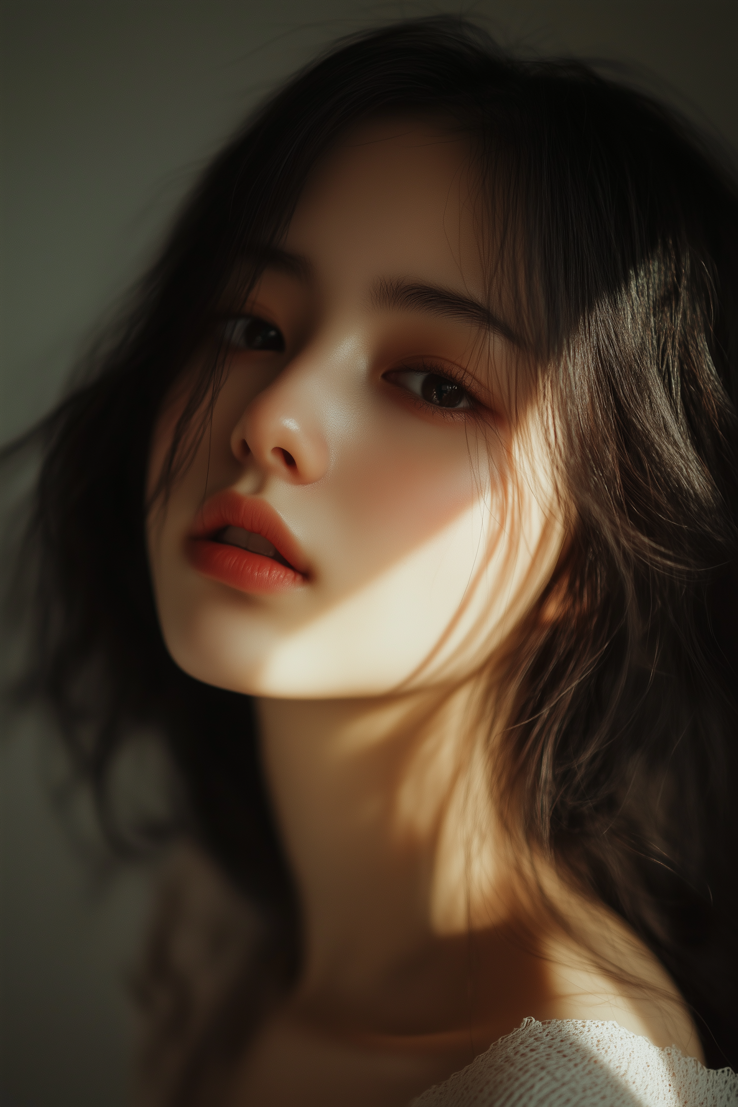Portrait of a young Asian woman with soft lighting and serene expression, highlighting her delicate features and smooth complexion.