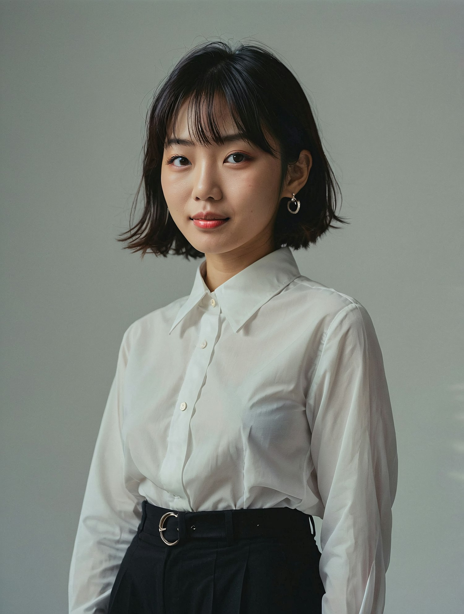 Asian woman in white shirt and black trousers, with short black hair and hoop earrings, posing confidently against a neutral background.