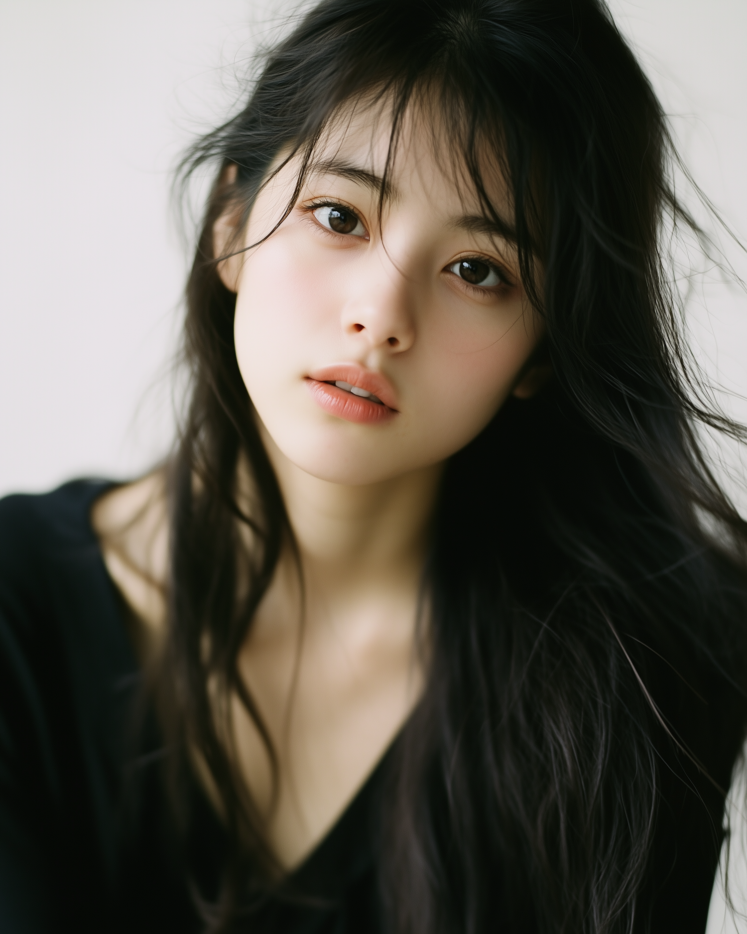 Portrait of a young Asian woman with long black hair and expressive brown eyes, wearing a black top against a soft white background.