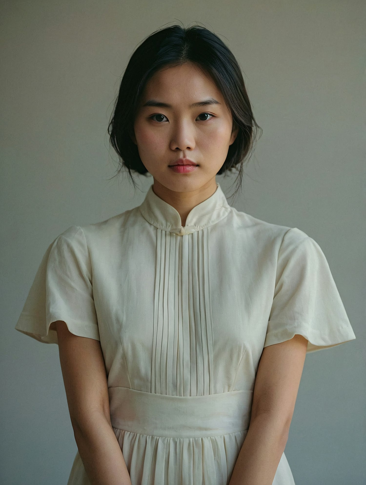 Asian woman in a cream dress with pleated details, standing against a plain background with a calm expression.