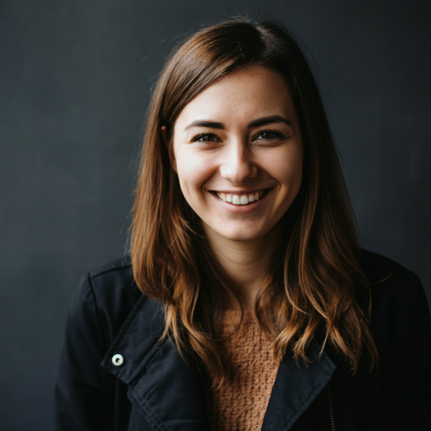 Smiling young woman with brown hair in a black jacket against a dark gray background, exuding warmth and friendliness.