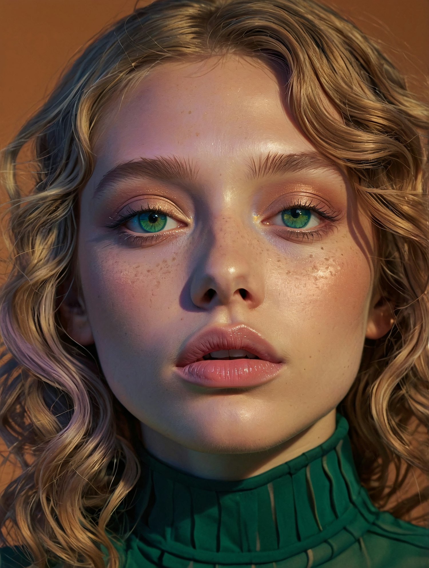 Close-up portrait of a young woman with green eyes, blonde hair, and freckles, wearing a green top against a warm background.