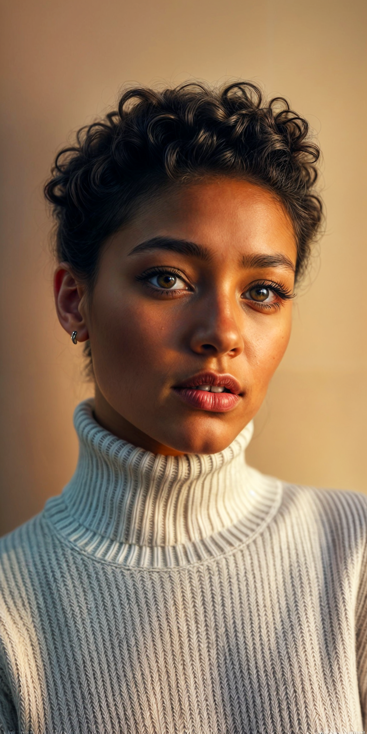 Portrait of a young woman with curly hair and hazel eyes in a white turtleneck, captured in soft lighting for a serene look.