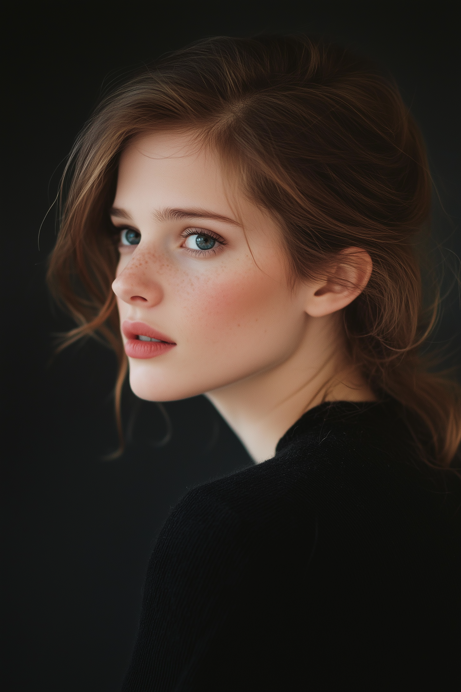 Portrait of a young woman with light brown hair and blue eyes, set against a dark background, exuding elegance and serenity.