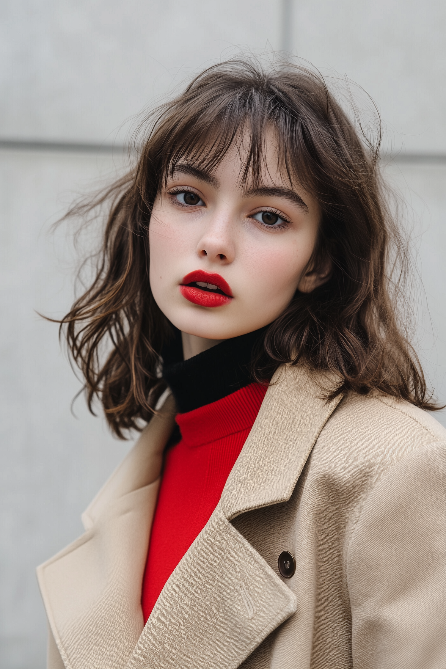 Stylish woman with wavy brown hair, red lipstick, and beige trench coat over red turtleneck, posing against a neutral gray background.