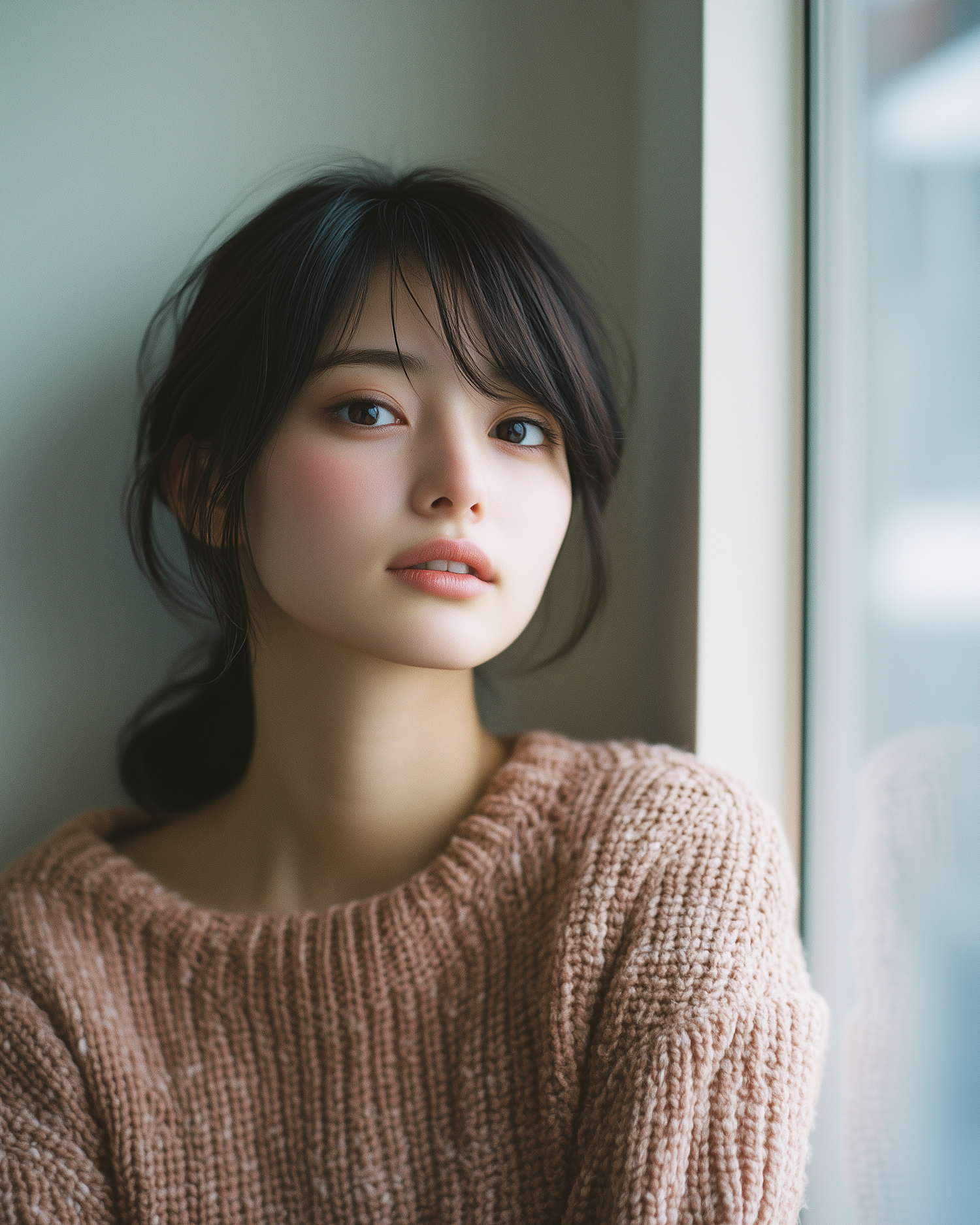 Asian woman in a cozy brown sweater gazes softly out a window, creating a serene and intimate atmosphere.