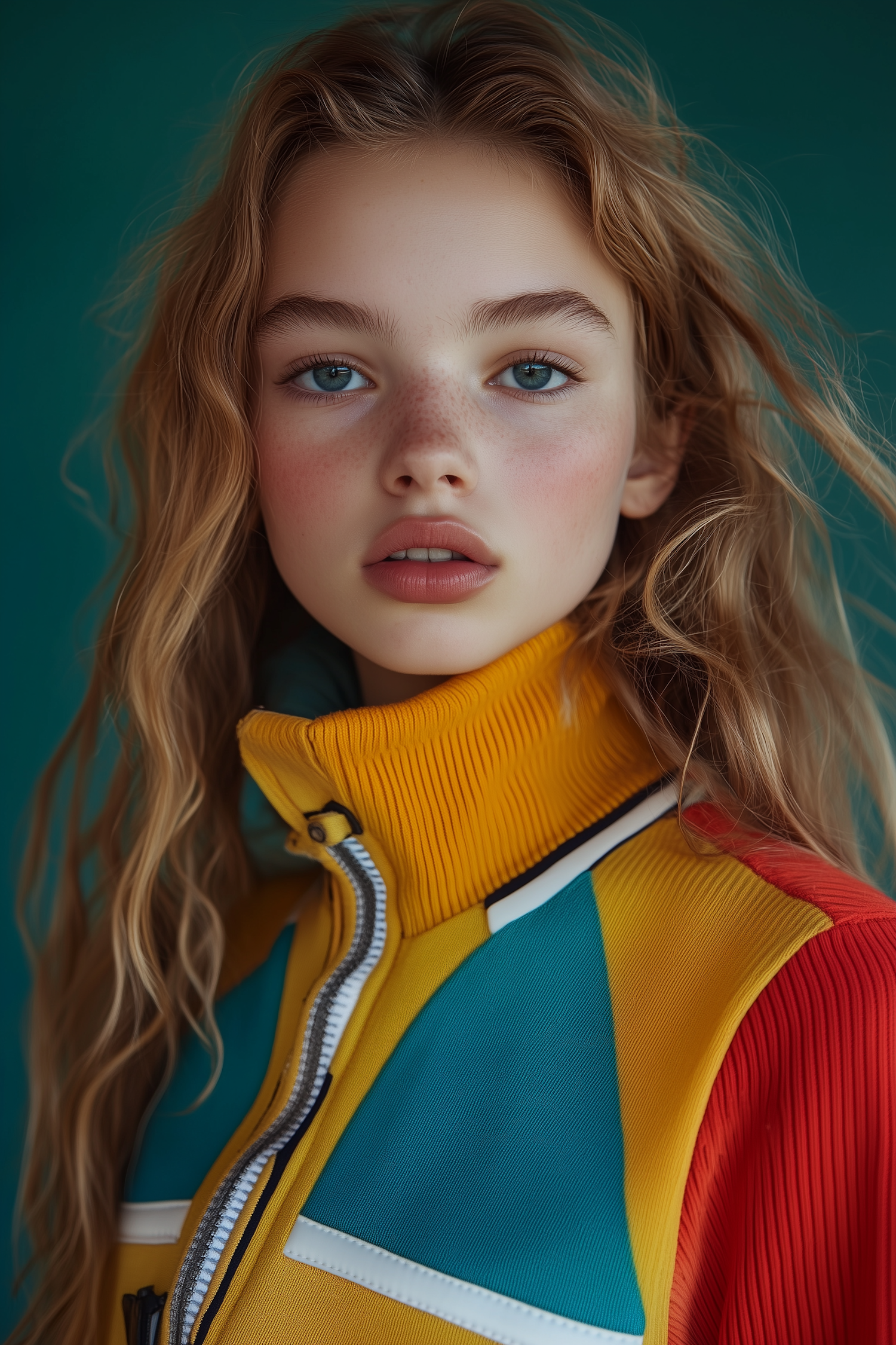 Young woman with blonde hair and blue eyes in a colorful jacket against a teal background, showcasing a serene expression.